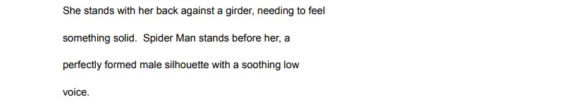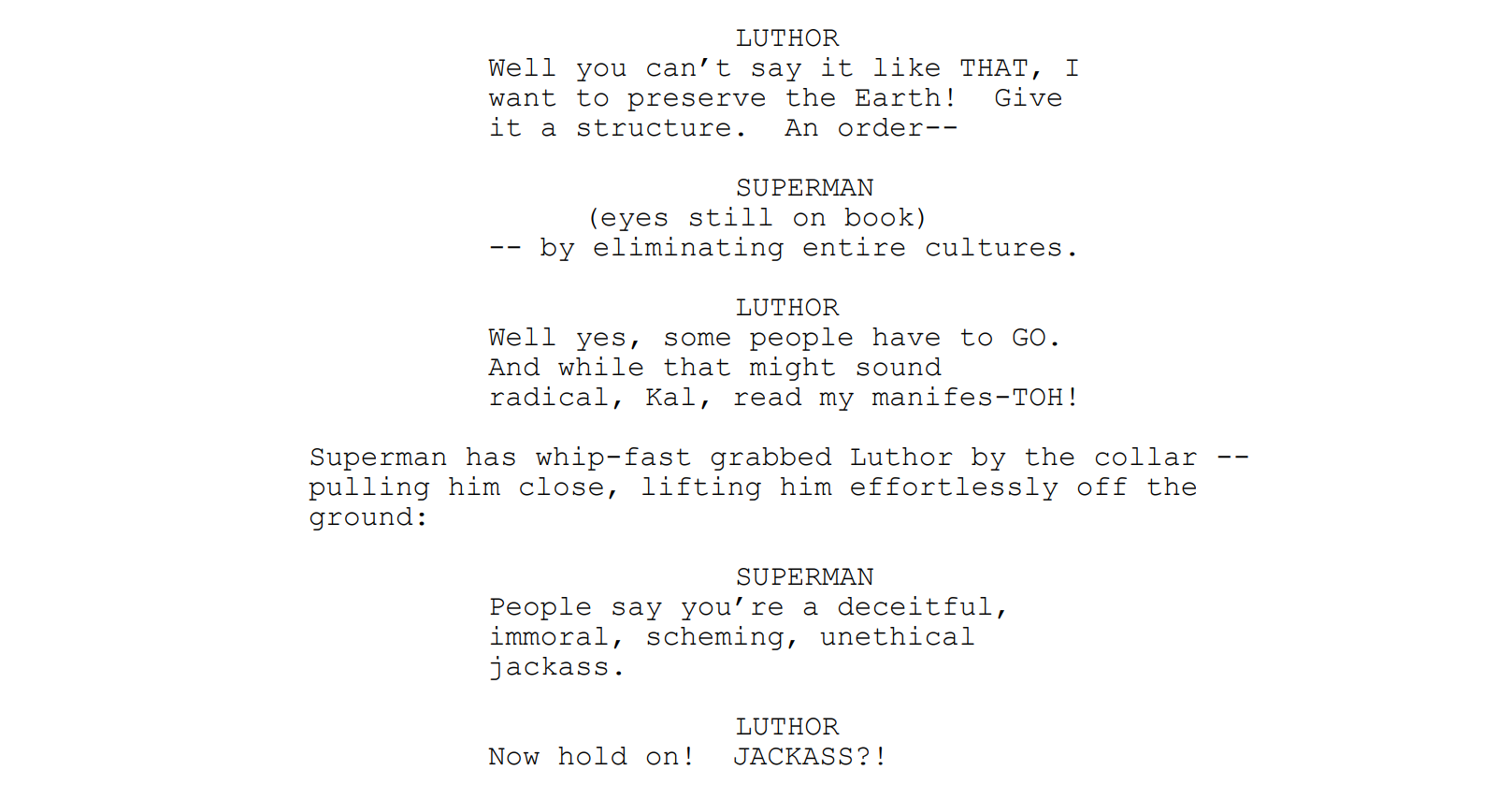 While some of the plot feels down the middle, and the dialogue feels more at home in a speech bubble than from an actor’s mouth, I feel that the action is a particularly strong suit of this draft – tapping into the comic-booky goodness you expect from superhero fare. Highlights include nanobots fusing to the Flash’s spine, making him vibrate so fast he phases into the planet’s core.