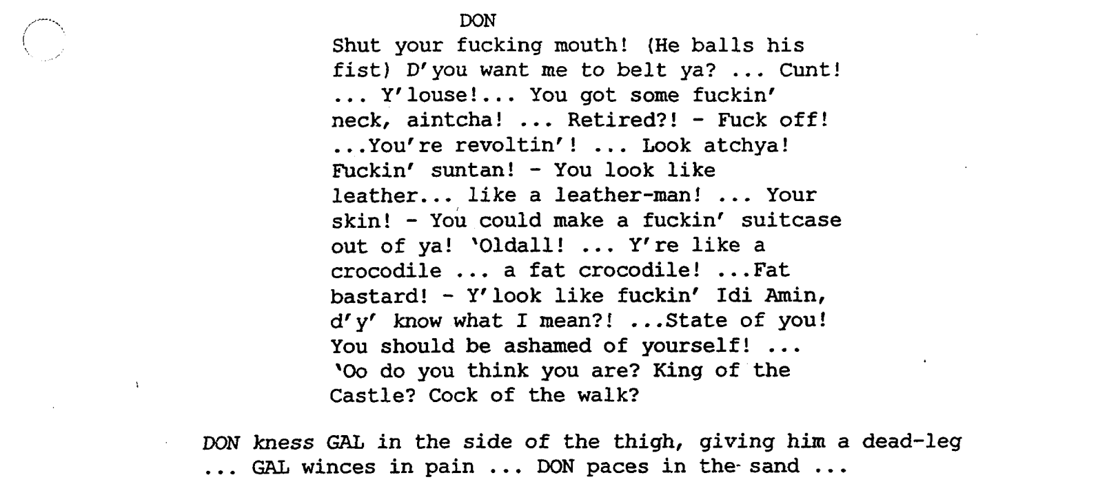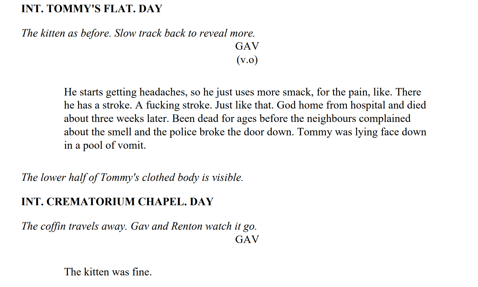 The available screenplay is oddly formatted but worth reading as an adaptation study. Hodge captures the dialect-heavy novel’s core, softening the rough edges while keeping its sharp, edgy tone. It’s packed with bleak humor, emotional rawness, and an anti-establishment vibe. I also love how it balances dark moments with surrealism and deadpan wit.