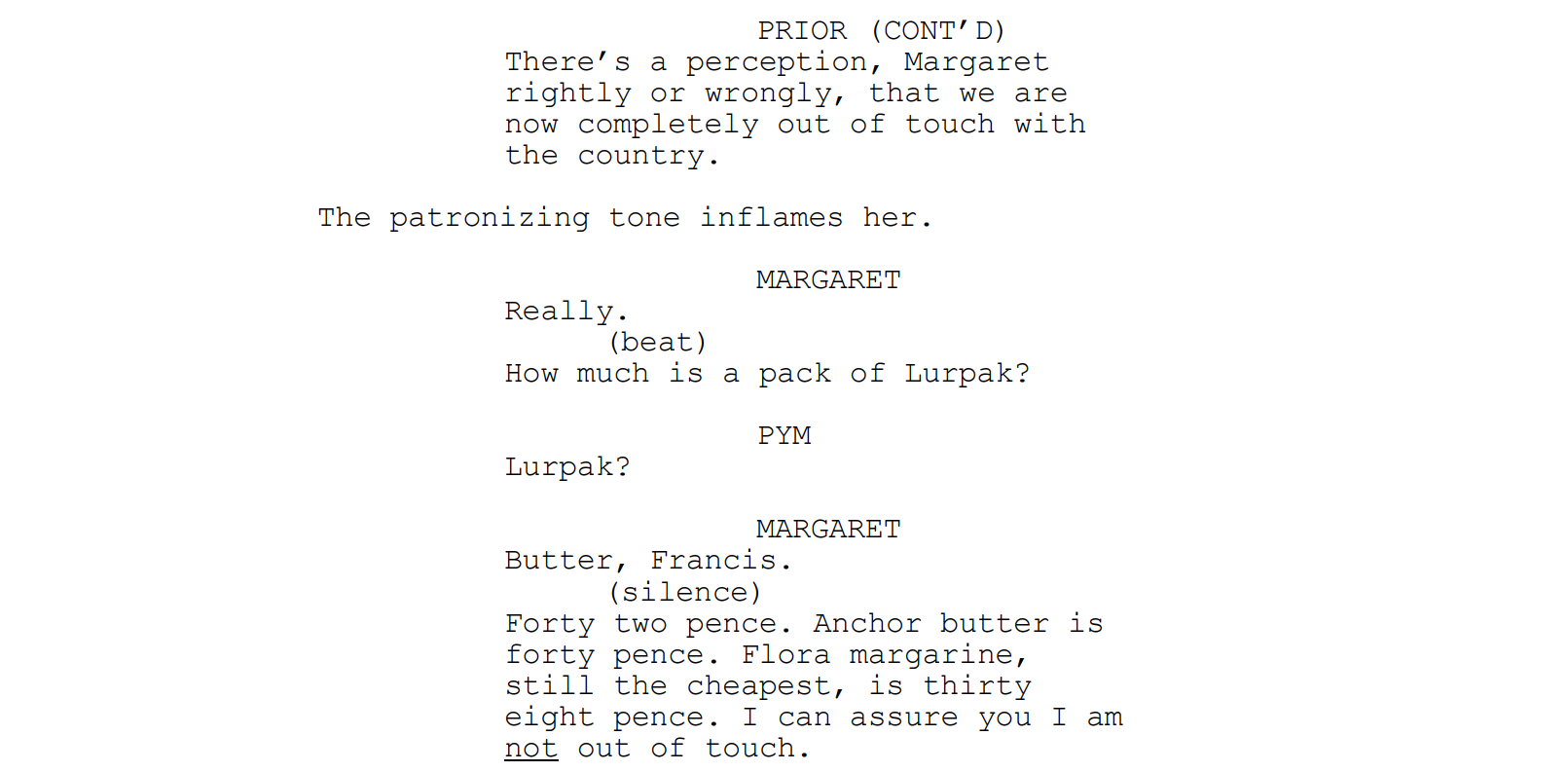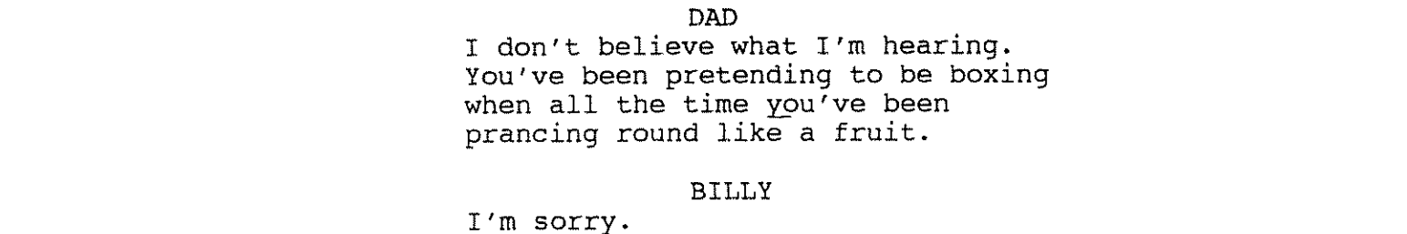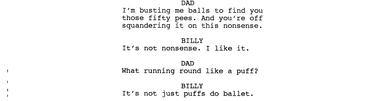 This is a special screenplay with a heartfelt and authentic portrayal of working-class life. Character development is exceptional, with Billy and his father reinventing themselves multiple times as they face the daily trials that life presents them. It’s bleak, it’s uplifting, it’s a cultural touchstone of British cinema. Mrs. Wilkinson is a delight of a character, the type of rigid hard-ass that is fun to write and slowly wear down.