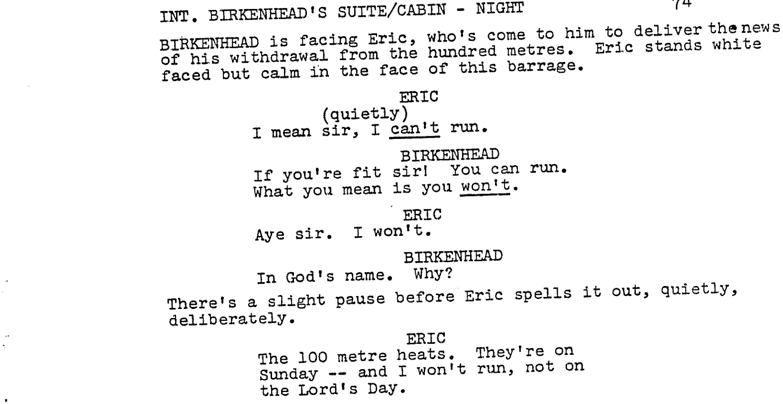 I’m always struck by the scene where Scotsman Eric Liddell refuses the Prince of Wales’ request to run his Olympic heat on a Sunday, breaching his religious values. It’s a powerful moment that pulls the audience both ways – we want Liddell to succeed, but to do so would be to erode everything he knows about himself.