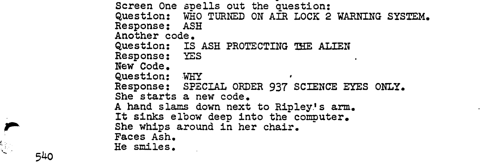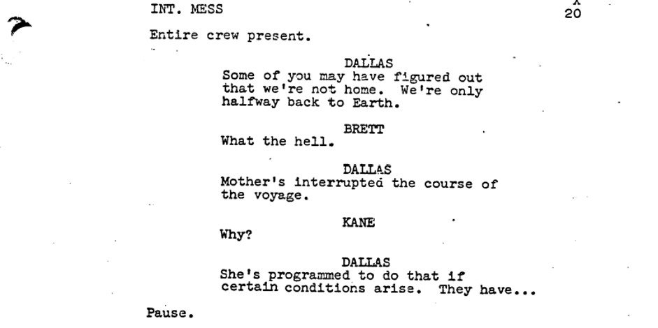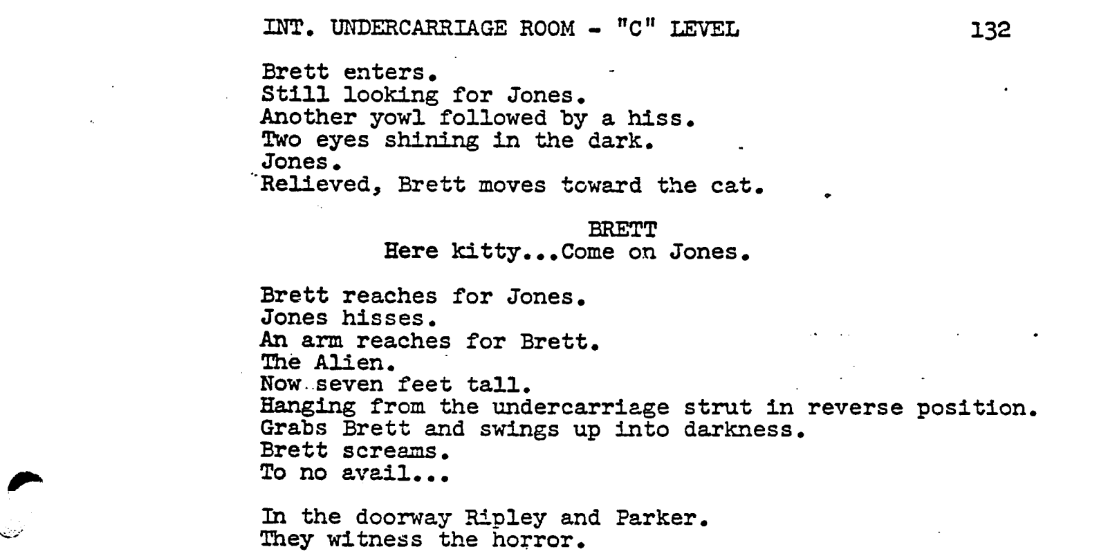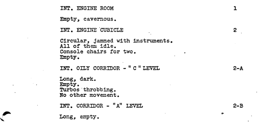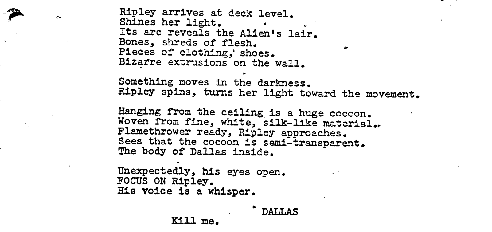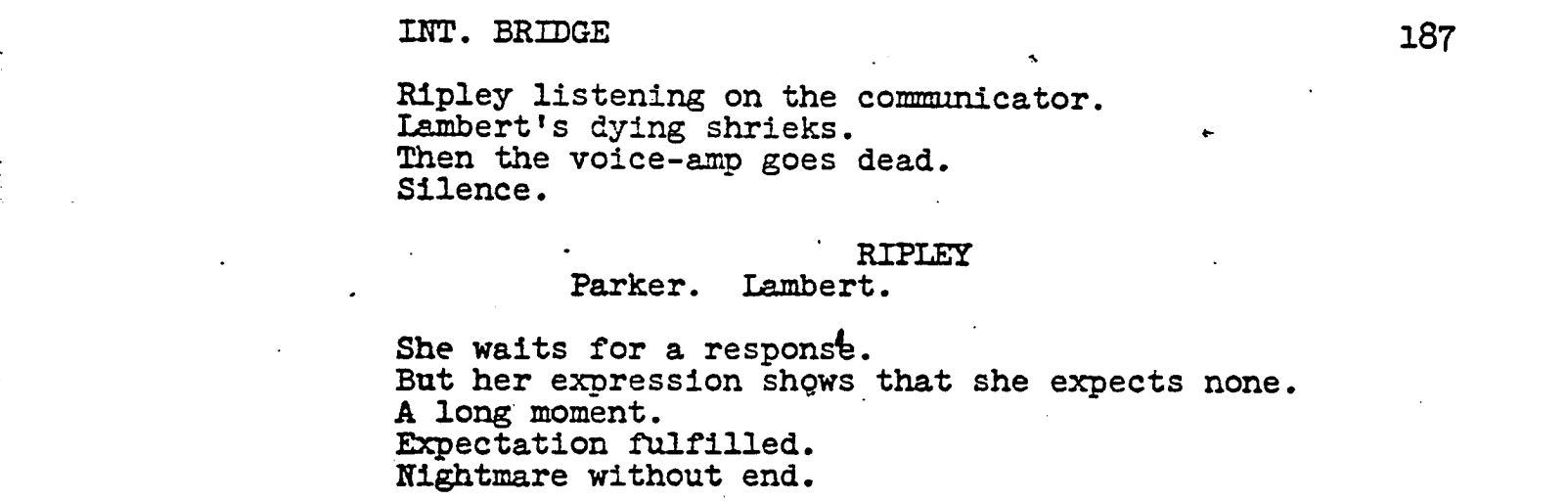 Unlike the film, where Ripley volunteers to follow the Alien into the vents, no one steps forward in the screenplay. As captain, Dallas takes charge, with Parker and Lambert covering the maintenance-level exit, while Ripley and Ash handle the airlock.
