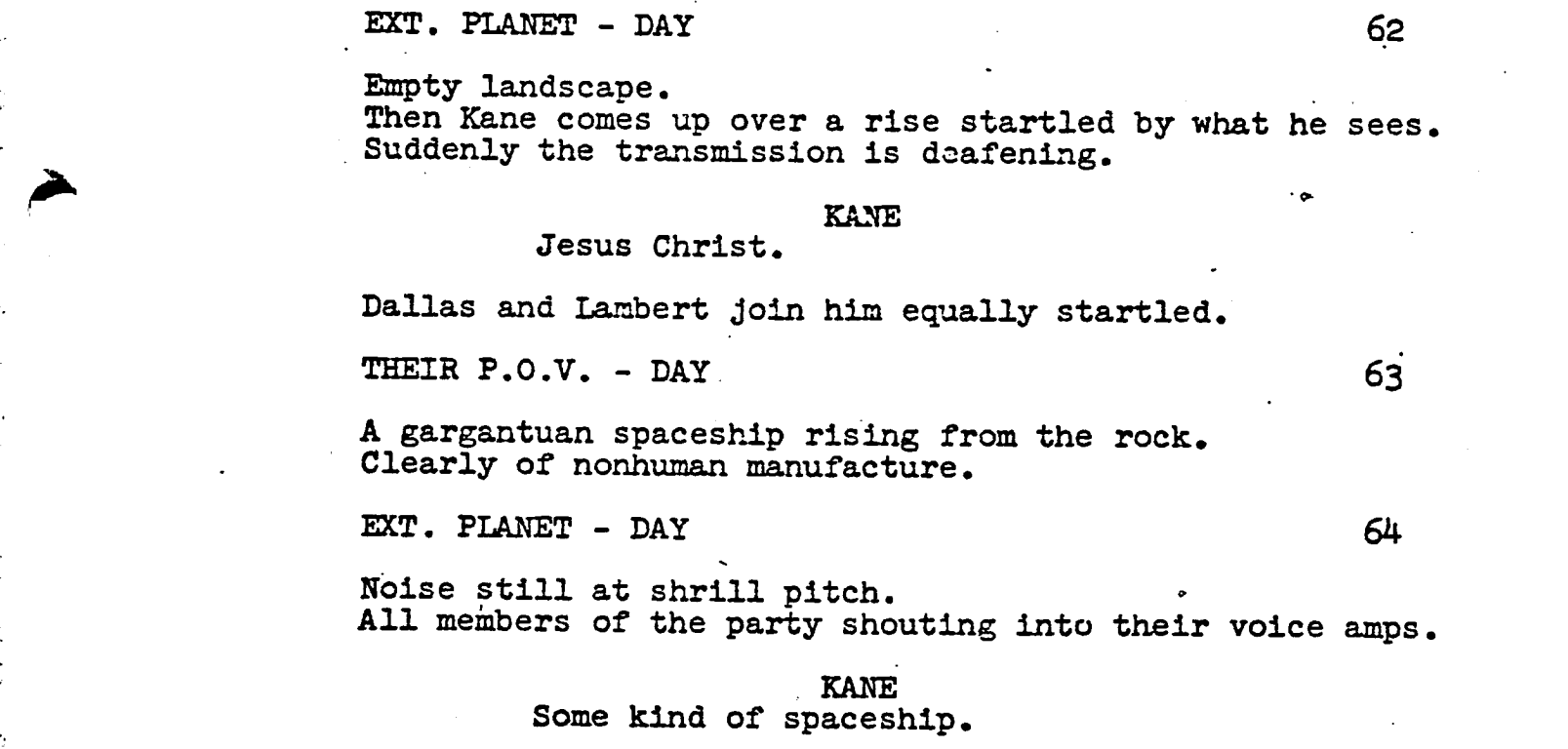 Unlike the film, where all three explorers enter the ship and find the ‘jockey’ skeleton, the screenplay only sees Kane descend, radioing his colleagues from below. He enters the cargo hold and discovers leathery eggs within. Dallas warns him not to touch them, but the creature inside – the ‘Facehugger’ – pierces Kane’s helmet and latches onto his face.