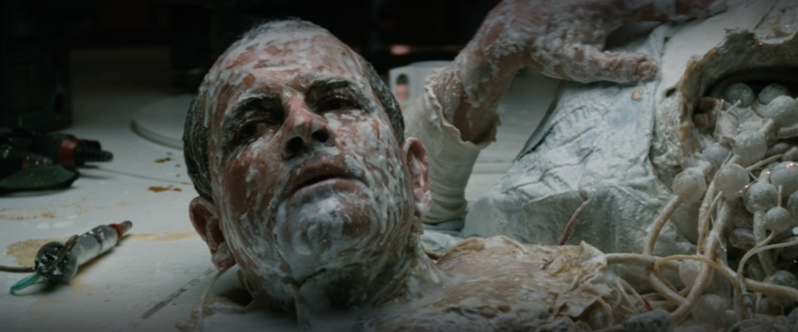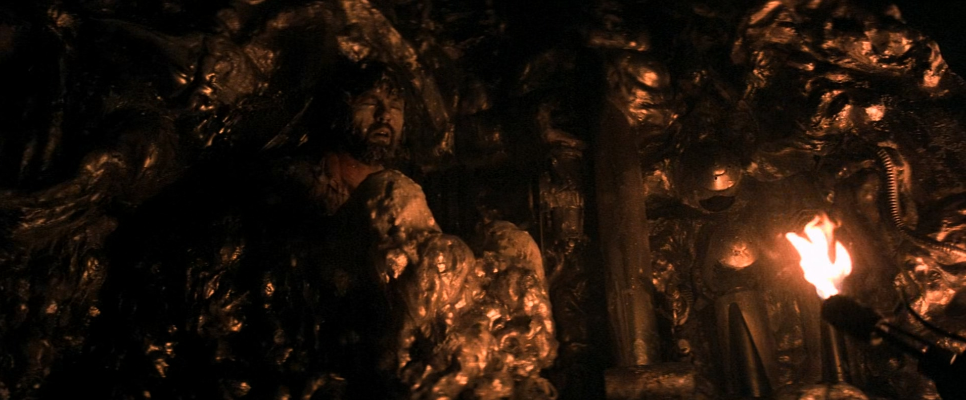 Now the sole survivor (barring Jones and the Alien) Ripley decisively activates the self-destruct. One of the script’s most striking scenes, cut from the theatrical release (the cocoon sequence later restored in the 2003 Alien: Director’s Cut), shows her stumbling upon the Alien’s lair, filled with grotesque organic pods housing the bodies of its victims.