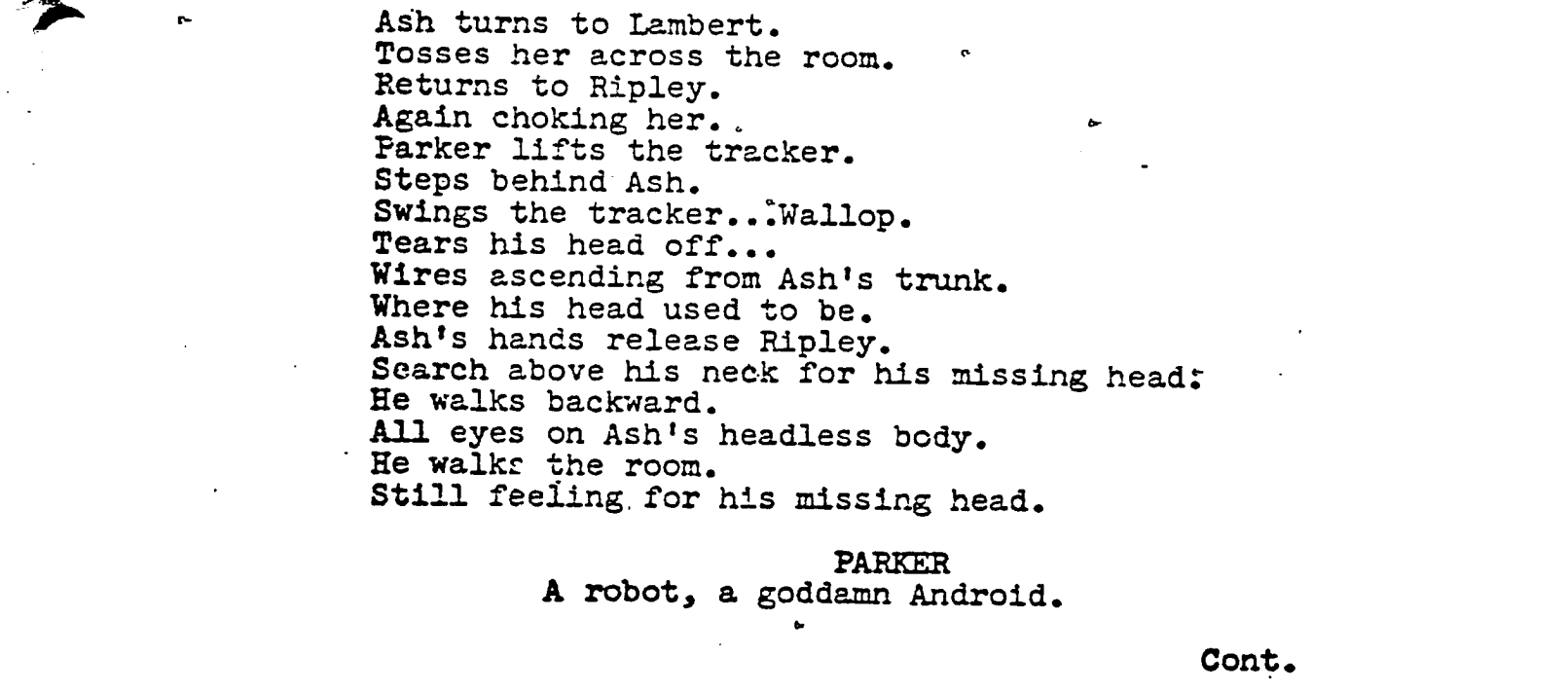 In the script, the survivors reattach Ash’s head to interrogate him, so we miss the iconic detached-head exchange. Ripley deduces that the Company always intended the Nostromo to respond to the distress signal, and Ash was planted to make sure it happened.