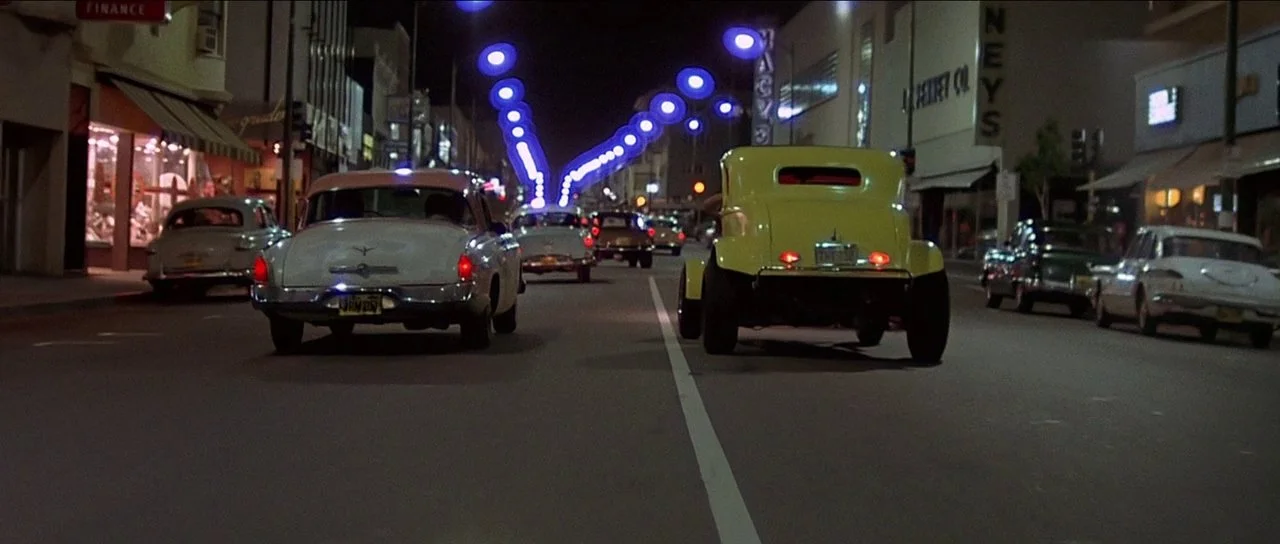 I had never heard of the term “hyperlink cinema” before a couple of weeks ago, and the odds are you haven’t either. To be frank, it was never a part of mainstream vernacular when it originated, and the style of filmmaking it refers to has become so commonplace in the past thirty years that separating “hyperlink” films from films with a traditional narrative style isn’t altogether that necessary. It’d be like characterizing a horror film as “elevated” today – they’re all elevated, so there’s really not much of a point in bringing it up. But I digress. To explain simply, “hyperlink cinema” refers to movies that are characterized by multiple characters’ narratives, focusing on a collection of plots centered around (or “hyperlinked by”) a common theme. Unlike an “anthology”, which contains a series of clearly distinct films, the various narratives within a hyperlink film all take place in the same world and are closely related. Some popular examples of this are Dazed and Confused, Magnolia, and Pulp Fiction. Of course, as cinema moves forward, writers and directors try to get more and more creative with the ways this kind of storytelling can be achieved. Richard Linklater’s Slacker did it in perhaps the most abstract way, giving each character less than ten minutes of screentime each. And Adam McKay’s The Big Short poked fun at the absurdity of the style, often having his characters speak directly to the camera to say what parts of the biographical film were completely fictionalized for the sake of interesting interactions. But before any of these films could figure out ways to dissect hyperlink cinema, there was one film that pulled it off in an especially simple, yet massively more effective way: George Lucas’s American Graffiti.