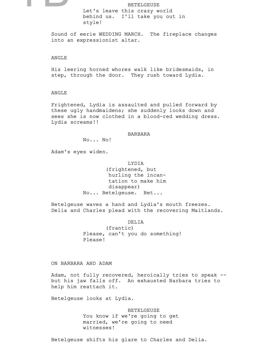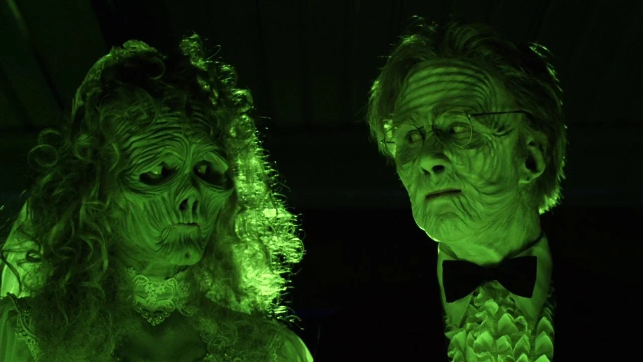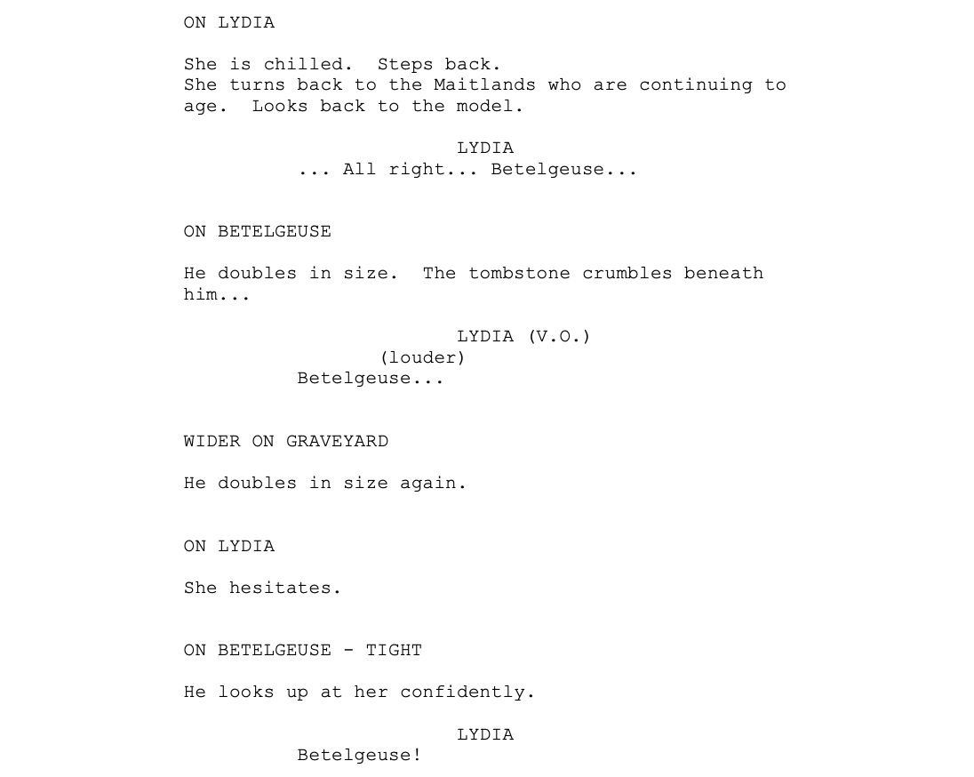 The couple rapidly ages, decaying quickly in front of an entire party of guests to marvel at. Lydia begs Otho to stop, but it’s too late. With nothing else to lose, Lydia runs over to the miniature town and calls upon the one person left who might be able to help: Beetlejuice.