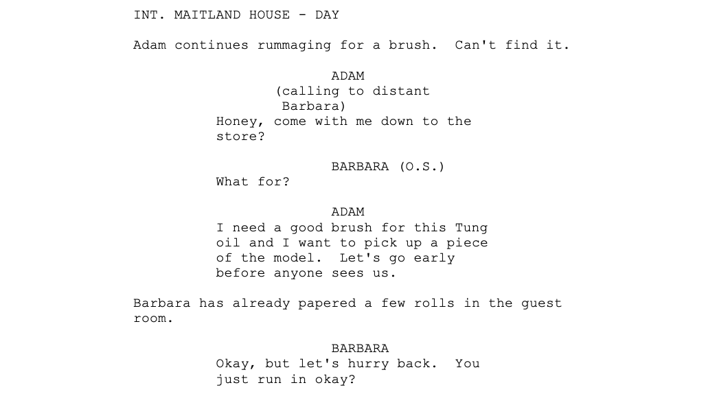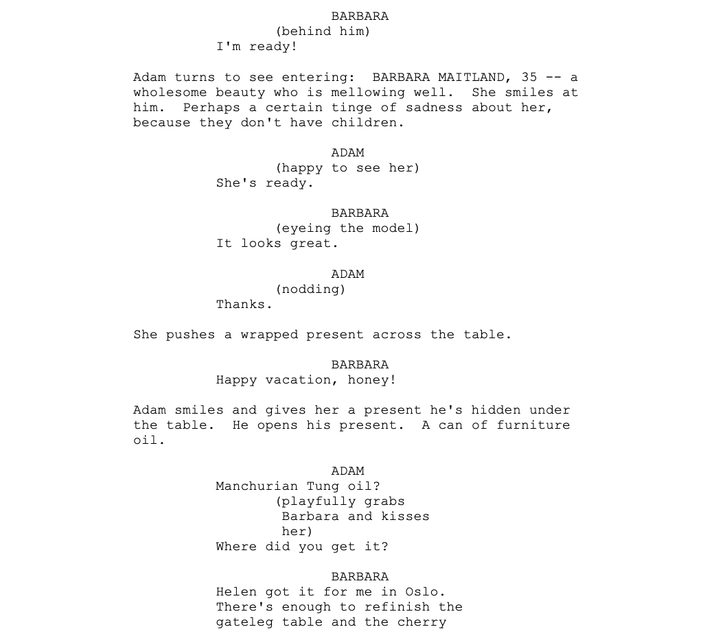 We soon discover that the owner of the model is Adam Maitland, a dorky artist who owns a craft store with his wife, Barbara. This is their home; the setting of their quiet, perfect life together. The two exchange gifts with each other as a way to kick off their vacation–one they’re spending at their favorite place on Earth: their house.