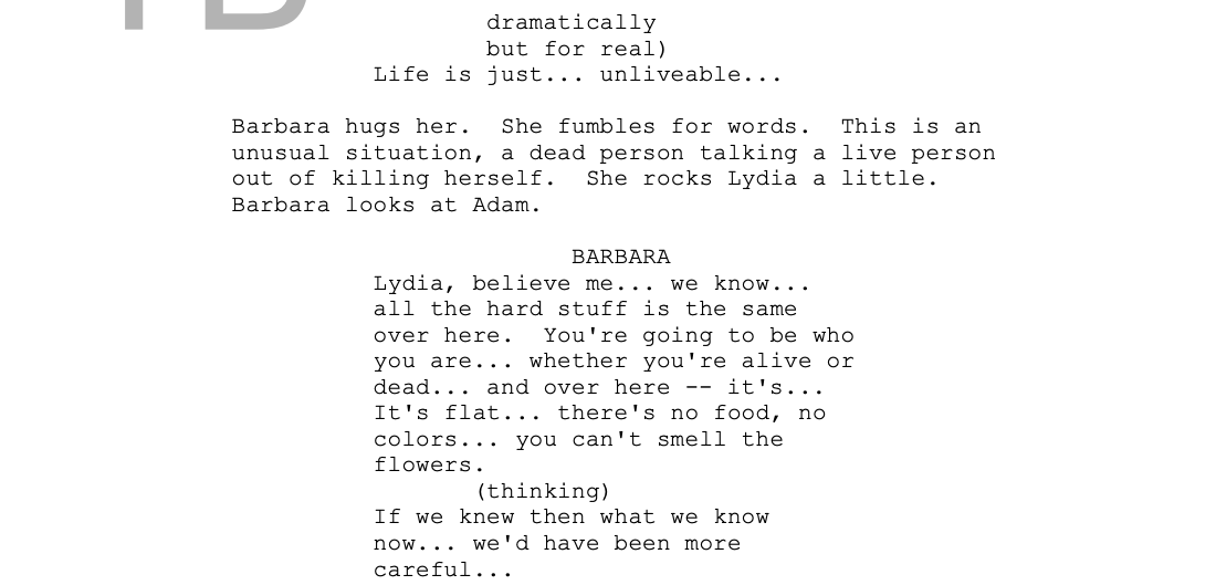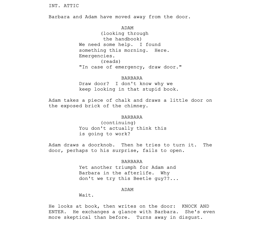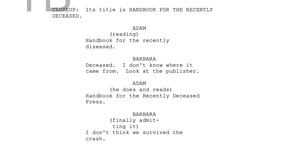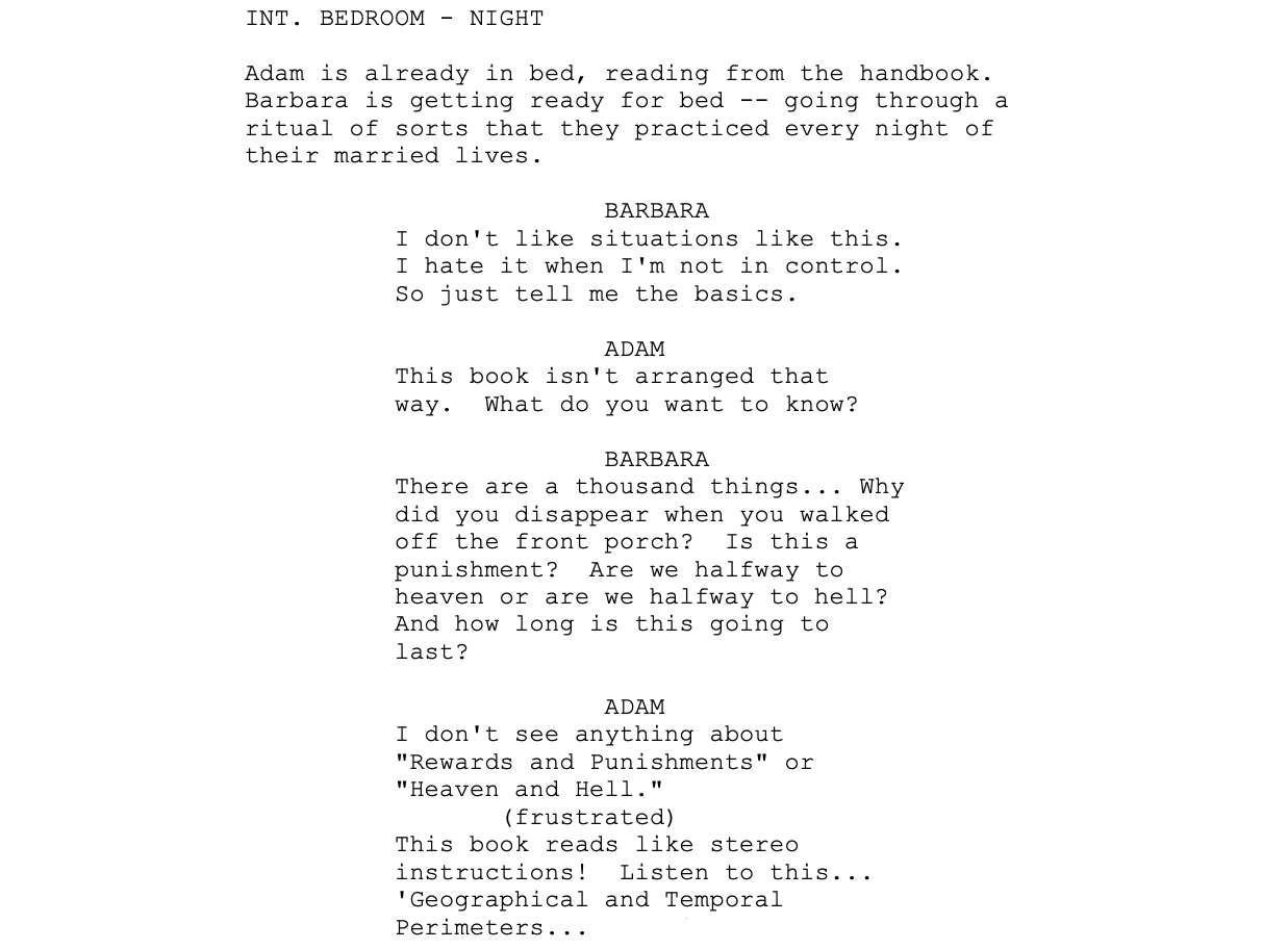 Adam and Barbara go over the Handbook while lying in bed, desperately attempting to figure out what dying really means.