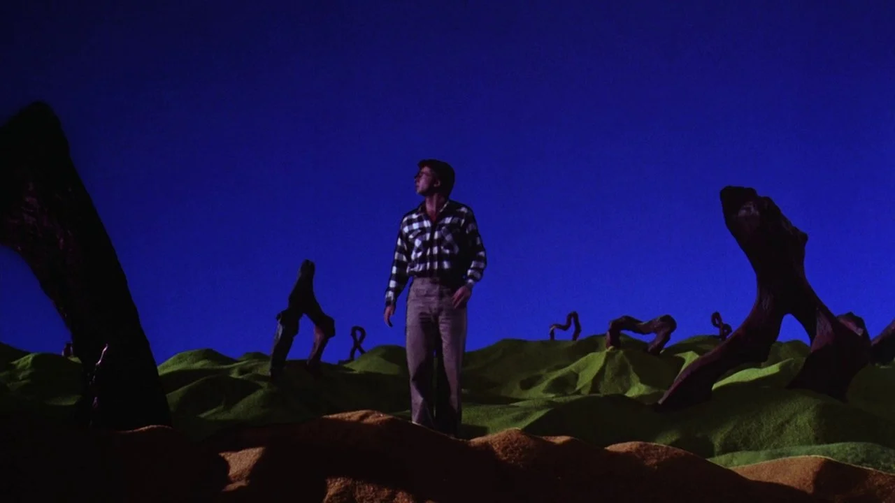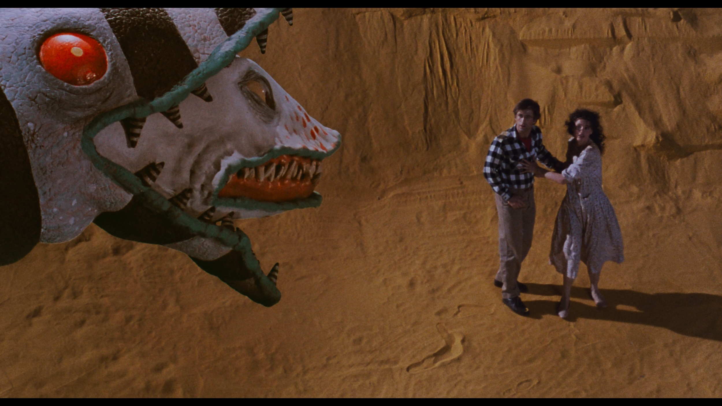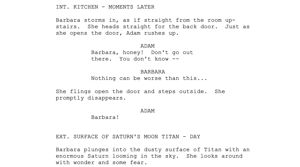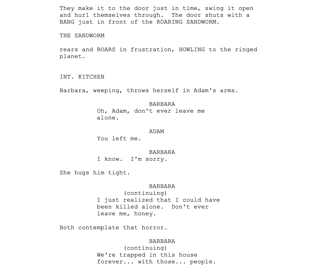 Desperate to escape, Barbara runs out the back door to see just how bad it is for herself, and finds herself right on Titan, one of Saturn’s moons, and being chased by a sandworm (I don’t know why Adam got the weird gear-monster universe when he left, but this is obviously the better choice for the film).