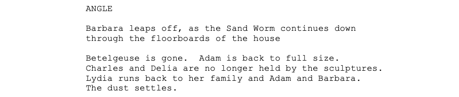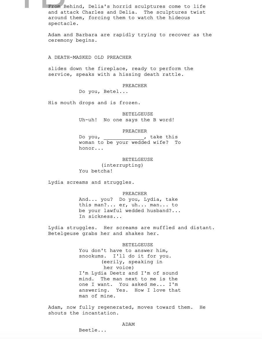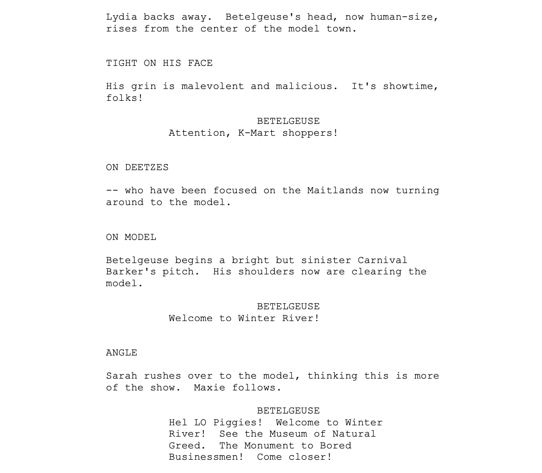 Although I should once again note that this ending changed slightly in the final film, because, after all, this movie is also TIM BURTON’s world, in fact, most of the changes in this film were made to lean into Burton’s fun visual gags and spice up Beetlejuice’s character to match Keaton’s energy, and they all totally worked. But the ending is something I especially like more in the film version. In it, Charles and Delia stay in the house. Instead of forcing their city lifestyle into this country home, they revert it to its old ways and use it as a place to relax, living happily amongst the Maitlands. Also, rather than kicking and screaming from the model town, Beetlejuice gets sent to the waiting room for the recently deceased. Not wanting to wait several hundred years for his appointment, he secretly switches tickets with another customer (a jungle explorer with a shrunken head–one of Burton’s additions to the story, no doubt). When the shrunken head man discovers this, he sprinkles some magic dust onto Beetlejuice, shrinking his head too. And the audience is left with the image of a once again belittled Beetlejuice screaming as his skull gets tinier and tinier and tinier.