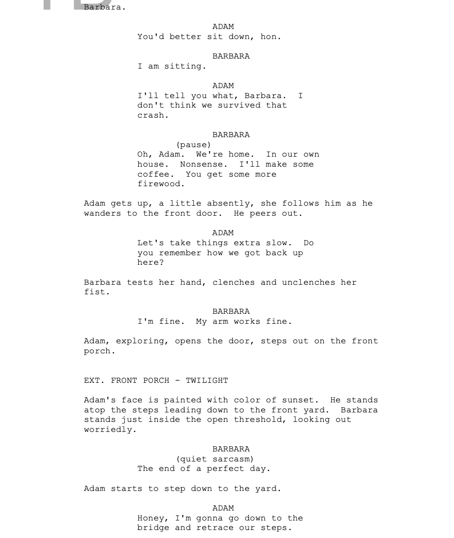 Adam, suspicious of the oddities that have been plaguing them since the crash, walks out the front door to retrace their steps. Just as he steps off the porch–POOF–he disappears.