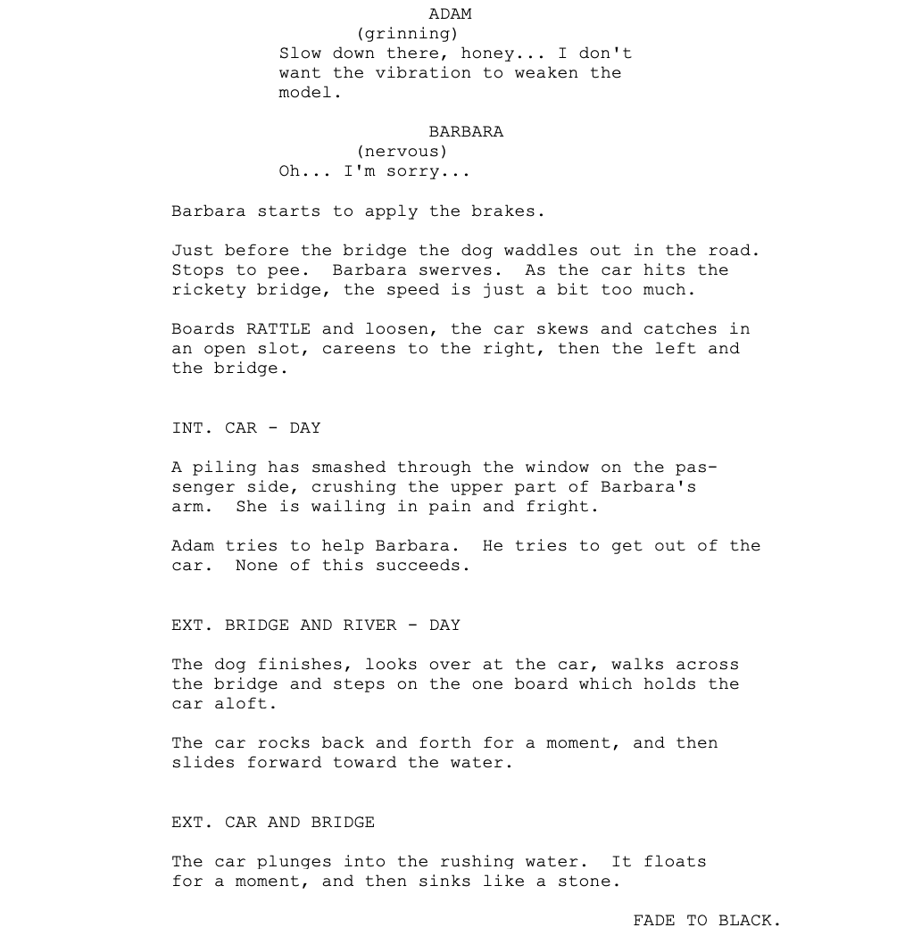 They finish their errand, hop back in the car, and make their way across the old rickety town bridge when suddenly a dog walks in front of the car.