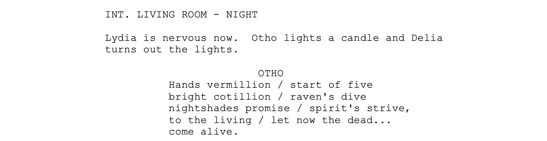 Delia retrieves their wedding outfits from the closet, lays them on the dining room table, and the entire party begins a seance.