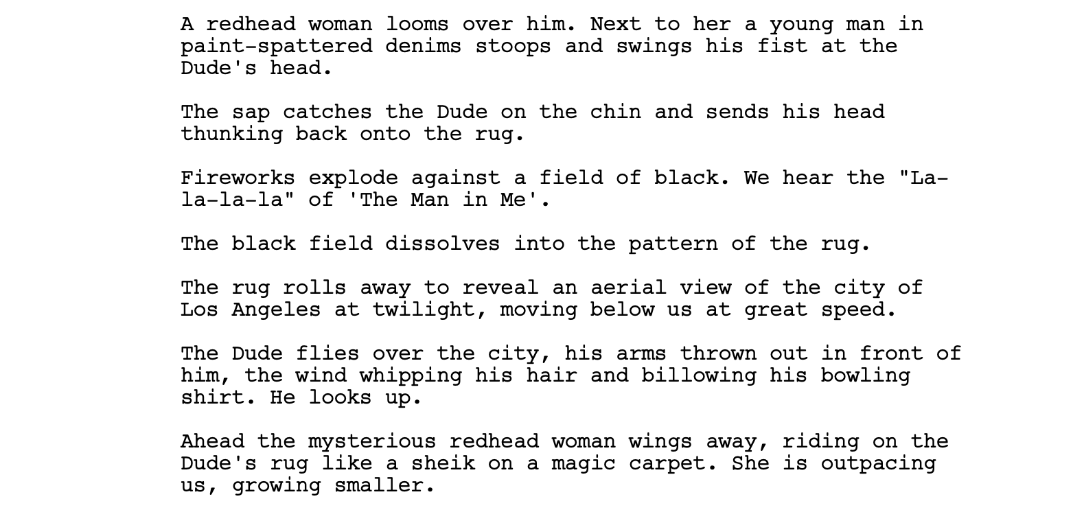 They could have closed on the Narrator, Walter, or even The Dude, but I think they chose this random individual for a reason: this ethos applies to everyone, not just the characters of the story. Also, note the question mark at the end of the final action line. They very obviously weren’t sure whether to end on a positive, negative, or vague note when writing this script. But if you watch the final cut, they very clearly show him hitting a strike. Perhaps they realized they needed to end this tale with some optimism after all.