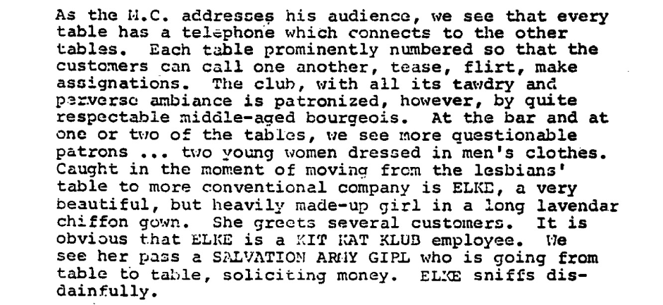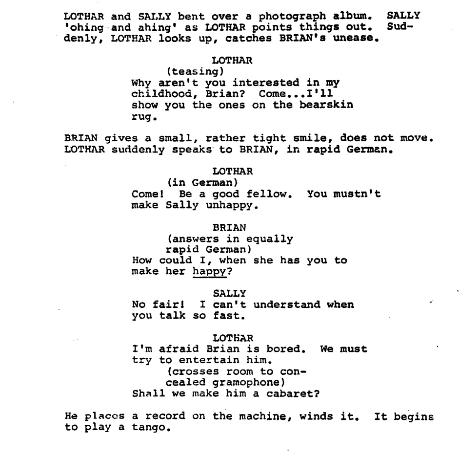 Brian forms a fast friendship with his new fellow tenant Sally Bowles, a charming young American woman with atrocious German and grand dreams of being a movie star. At the moment, her stage is the Kit Kat Klub’s cabaret, which Brian begins visiting regularly to watch her perform amid the club’s other risqué entertainments. A new character is introduced through these outings, that being Sally’s friend Fritz, who is eager to receive English lessons from Brian. They quickly become good acquaintances.