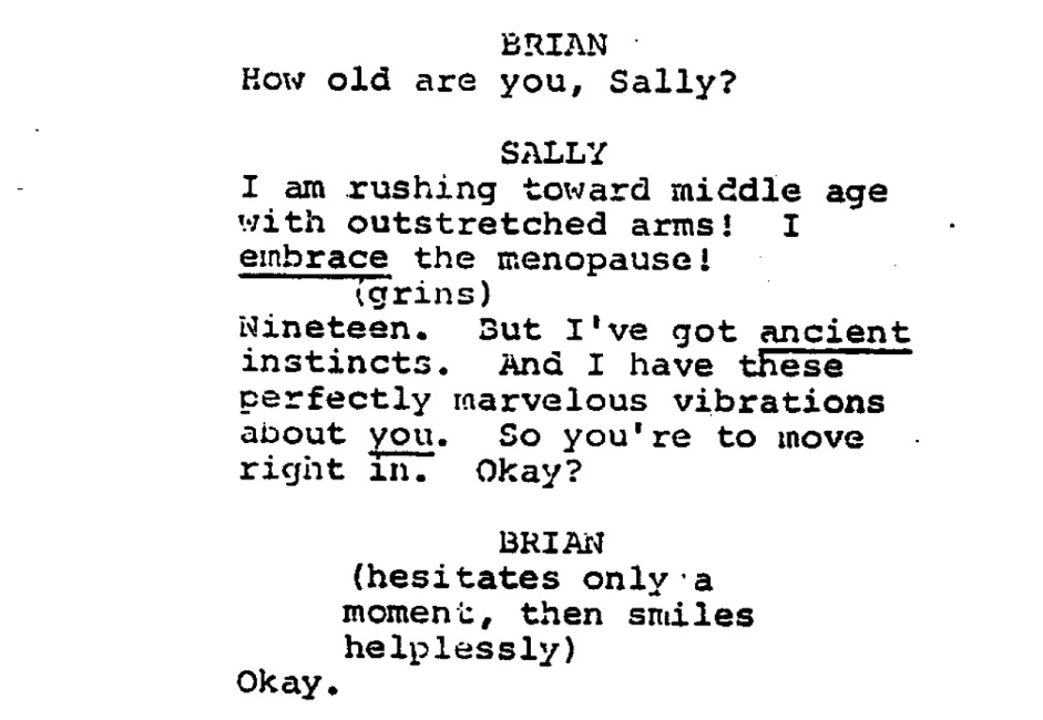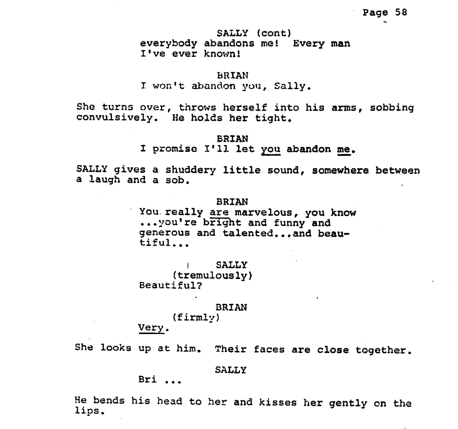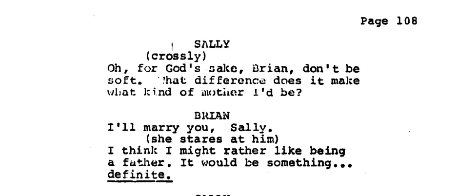 In the screenplay, the inciting incident arrives early, tightly interwoven with the setup. The original scene is omitted from the film, and is replaced with Brian’s first meeting with Sally Bowles. I emphasize this because I actually believe the scene from the original sequence better suits the narrative.