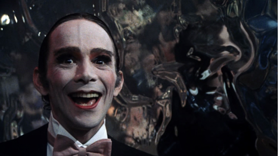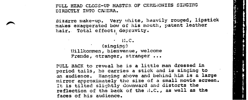 The credits end with a titillating drumroll and cymbal crash, giving way to a musical vamp. The first image is a close-up of the Emcee’s heavily made-up face, seen in reflective glass. He smiles directly at the camera with wide, doll-like eyes and a painted smile. “Wilkommen, bienvenue, welcome,” he sings, beginning the opening number by inviting the audience in.