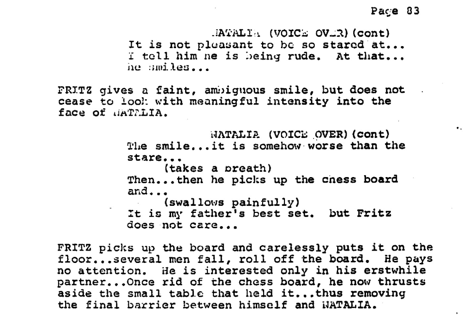At this point, the Fritz–Natalia storyline resurfaces after a period of absence. The film relocates and sanitizes Natalia’s confession about Fritz’s assault, reframing it as mutual attraction and a question of love versus tradition and her father’s approval. In the original screenplay, the scene is far less romanticized, carrying greater moral weight.