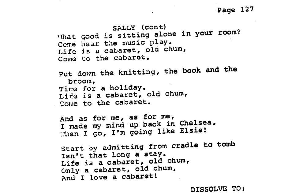Sally sings of an old friend, Elsie – earlier mentioned as a fleeting trace of her past – who lived recklessly and died amid drugs and liquor, smiling to the end. Life, Sally insists, is only a cabaret, so why look beyond it? As she sings, the film cuts to Brian boarding his train, passing two uniformed Nazis. Under his breath, he begins the song the Emcee once used to welcome us in.