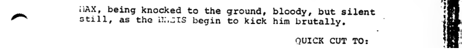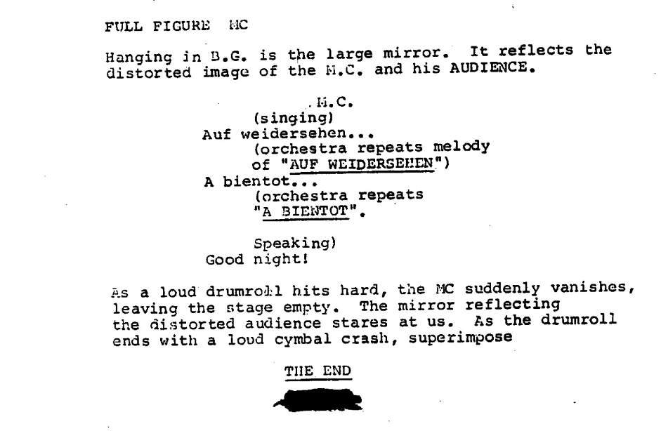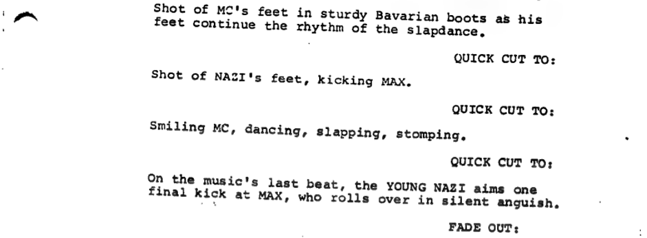 While the Emcee playfully performs a Slapdance comedy onstage, a group of Nazis in civilian clothes arrive to avenge the boy expelled earlier, mirroring the Emcee’s comedic violence with a brutal beating to the club’s manager Max. This moment layers real violence and political unrest beneath the Kit Kat Klub’s entertainment. Whereas the characters don’t acknowledge the attack, the screenplay ensures the audience cannot look away.