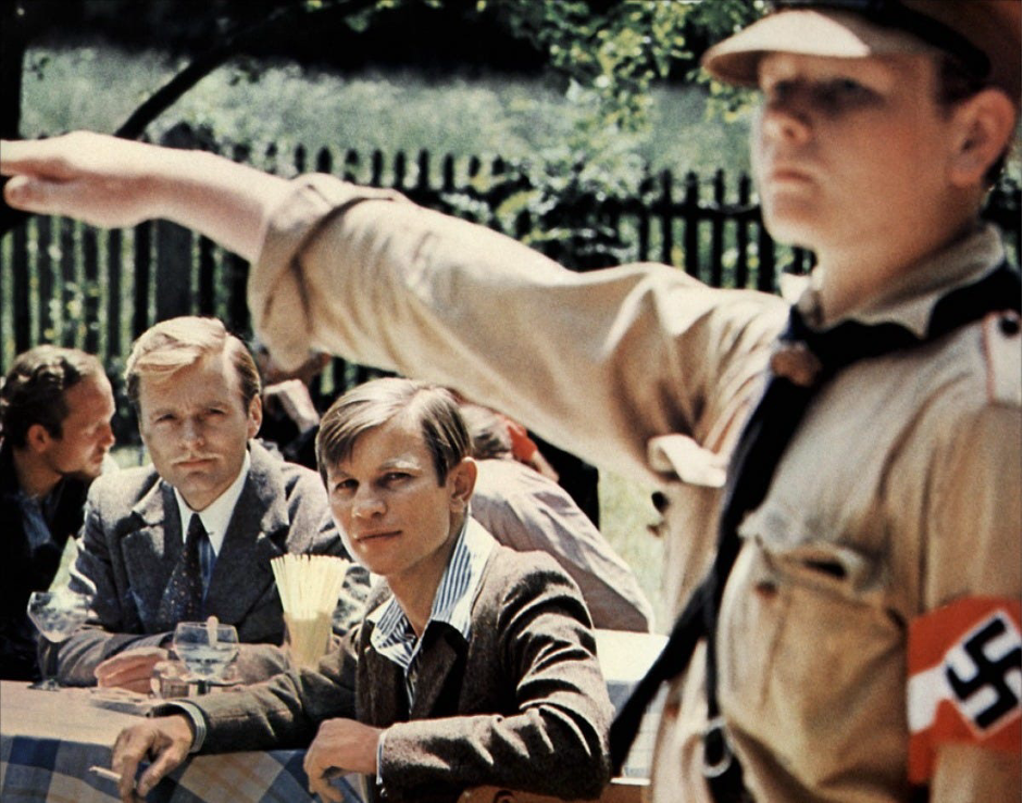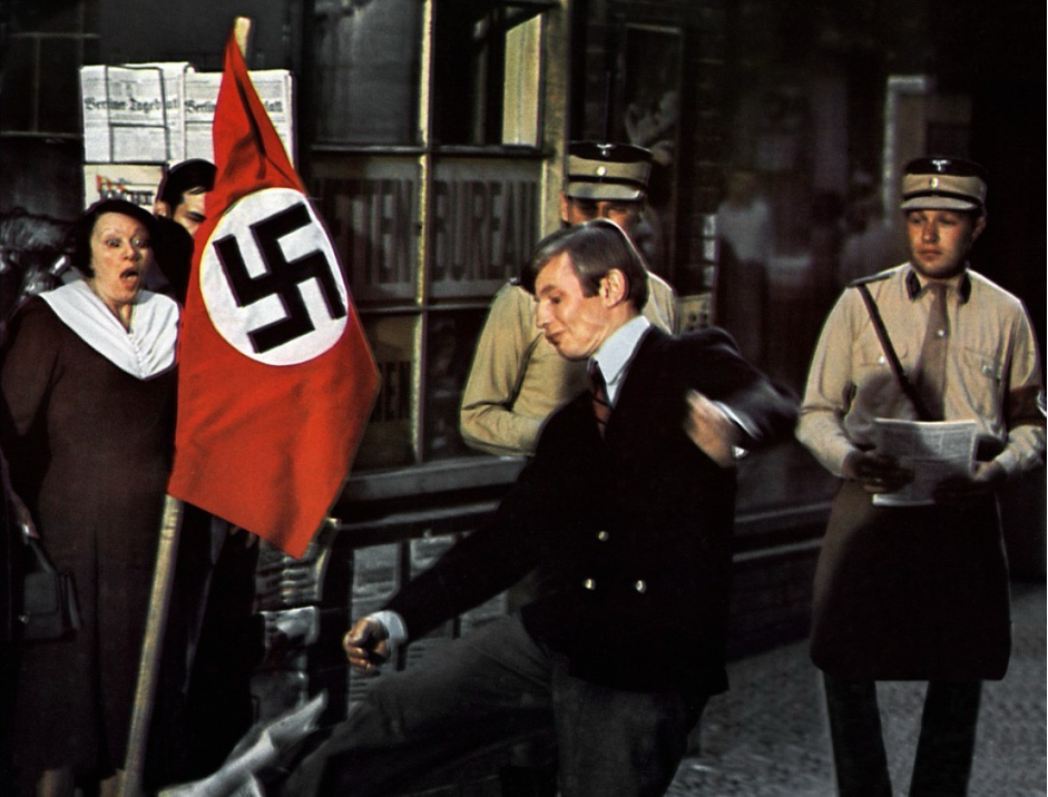 Signs of seismic change appear increasingly, but so far unnoticed or ignored by the main characters. The film subtly underscores the political shift with hammer-and-sickle graffiti, Nazi flags, and propaganda posters scattered throughout the backgrounds as their relationship develops.