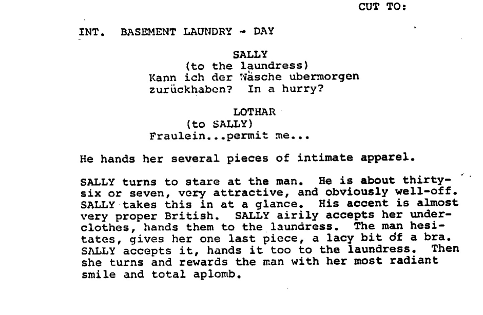 This act also delves more into Sally’s complicated relationship with her father, but many of the scenes developing this are cut from the final film. The film compensates for cutting Sally’s father scenes by advancing the Fritz–Natalia storyline. Following Sally’s advice, Fritz “pounces” on Natalia – on her father’s sofa, no less – a move that, improbably, succeeds. Natalia experiences genuine passion, more intense than anything in her sheltered life. But love alone cannot resolve their obstacles: she is wealthy and Jewish, and her father would never approve a marriage to a Christian man, especially one he might suspect is after her fortune.