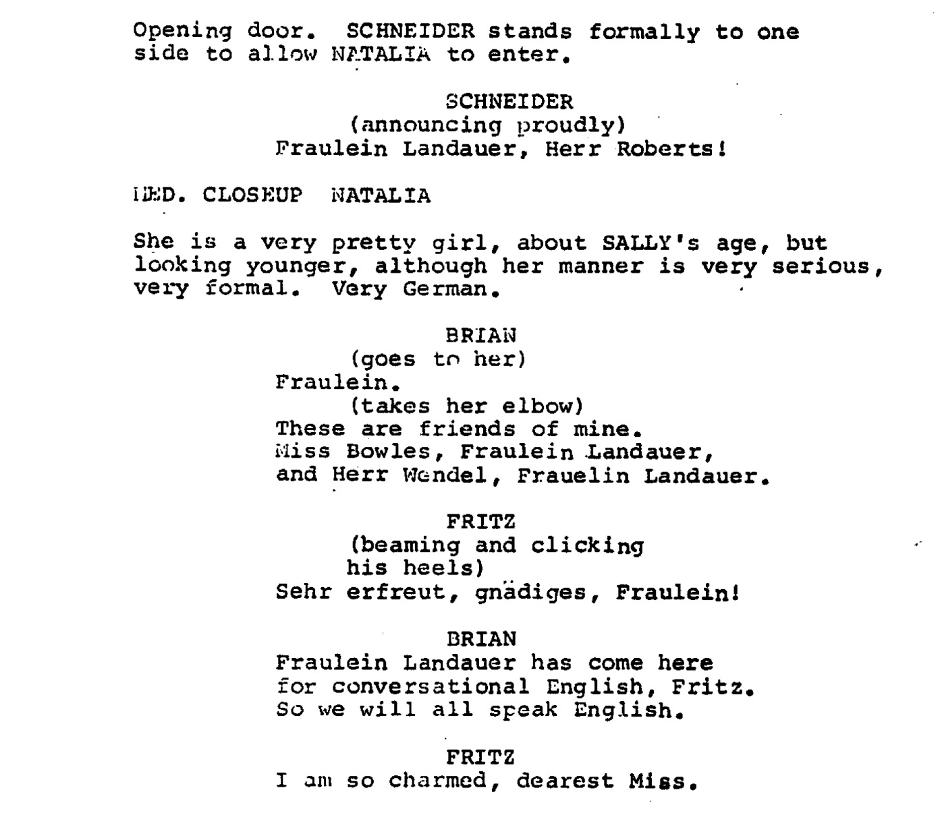 In the screenplay, Natalia comes to Sally’s home and confides what happened after Fritz followed Sally’s ill-advised counsel. She is visibly shaken and uncertain about how to proceed, questioning whether marriage is now expected after their sexual encounter. Complicating matters are her Jewish identity, Fritz’s Christianity, and her lingering sense that something is fundamentally “wrong” with him. This version is darker and more plausible, aligning more closely with the shifting tone of the third act.