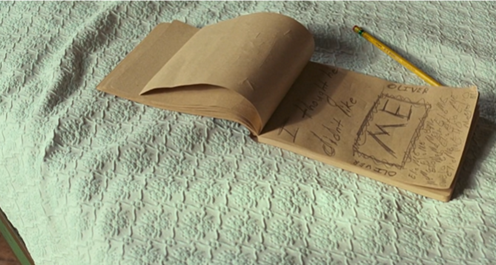 The immature joy of an adolescent crush can also be seen in Elio’s diary entry, written in big, scrawly letters. Oliver’s name litters the page, and Elio might as well be the stereotypical teenage girl writing “Elio + Oliver 4eva”. It’s frankly adorable, and it’s the first time the audience is able to see Elio’s thoughts written out plainly.