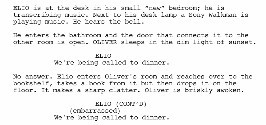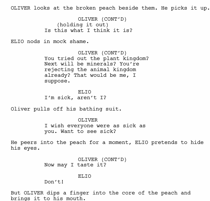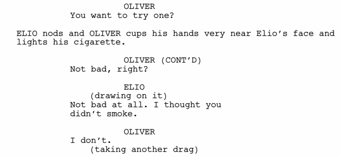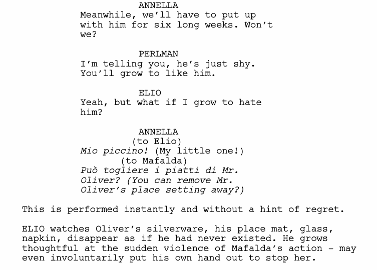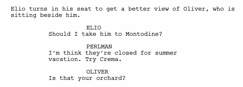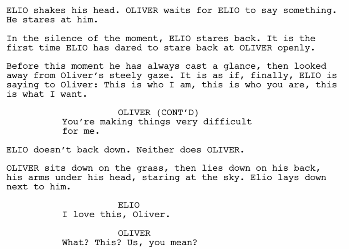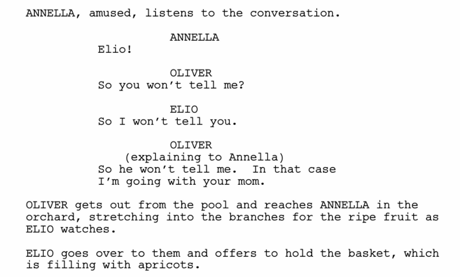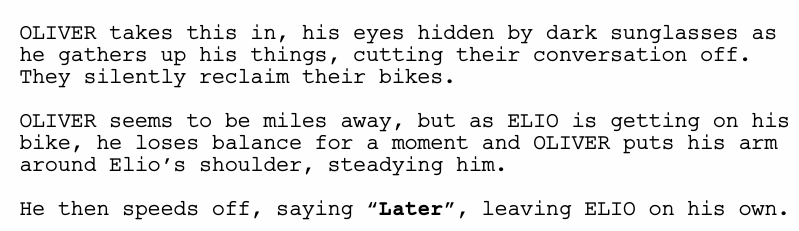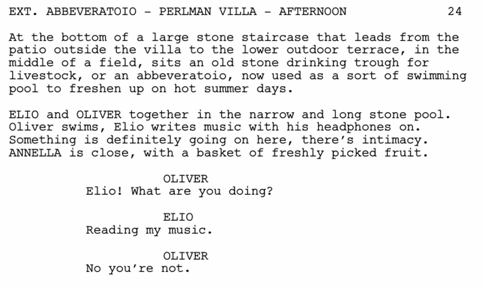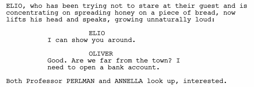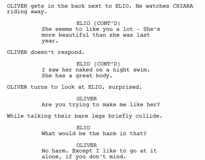 Elio and Oliver’s real meet-cute comes in the following scenes, during breakfast and their subsequent trip to the bank. The script emphasizes that Elio is already oddly fixated on Oliver, actively preventing himself from staring.