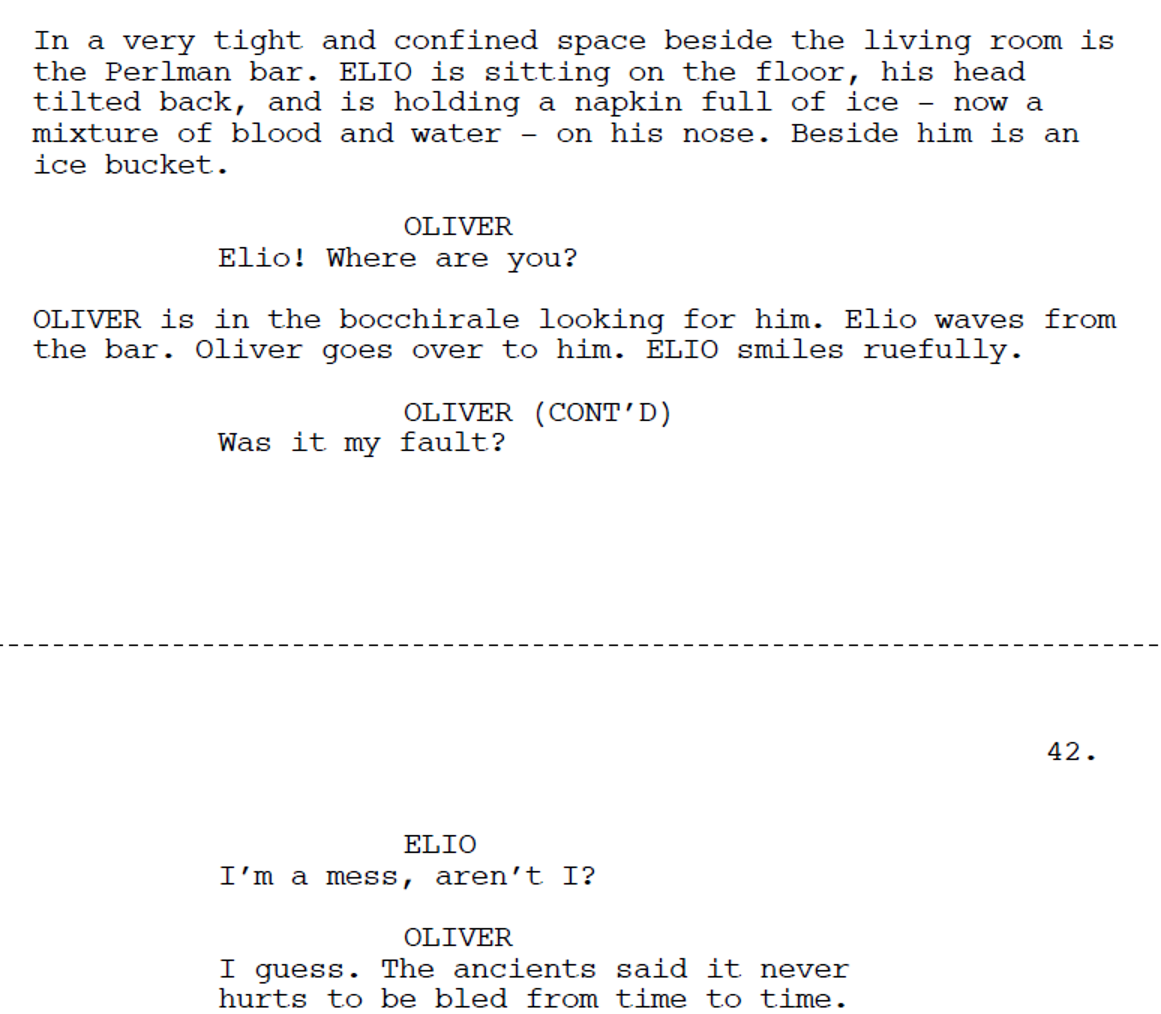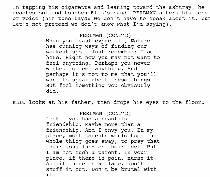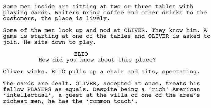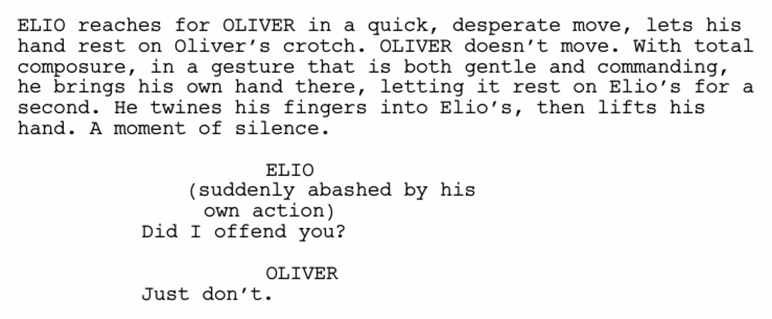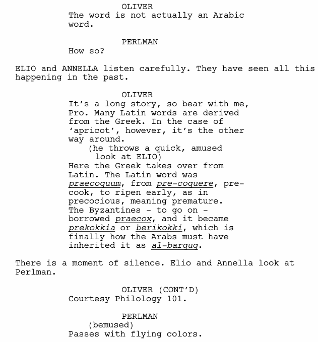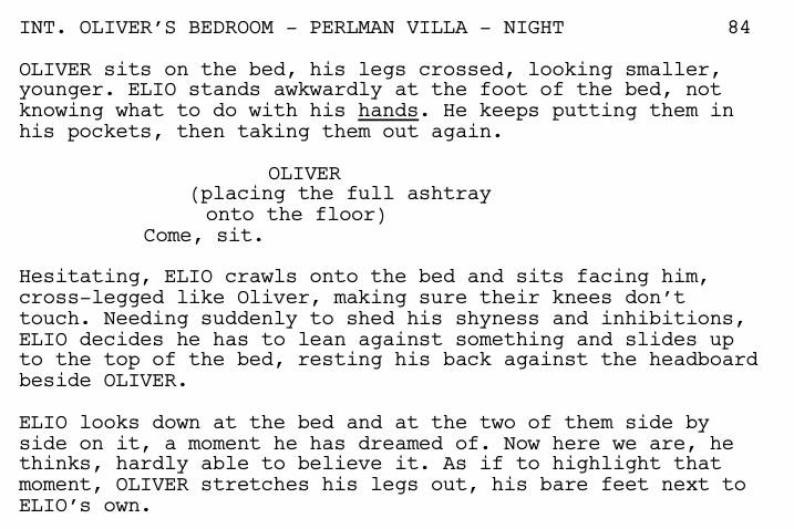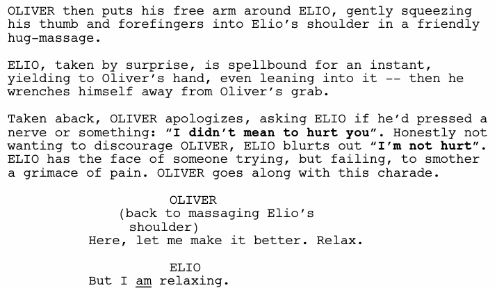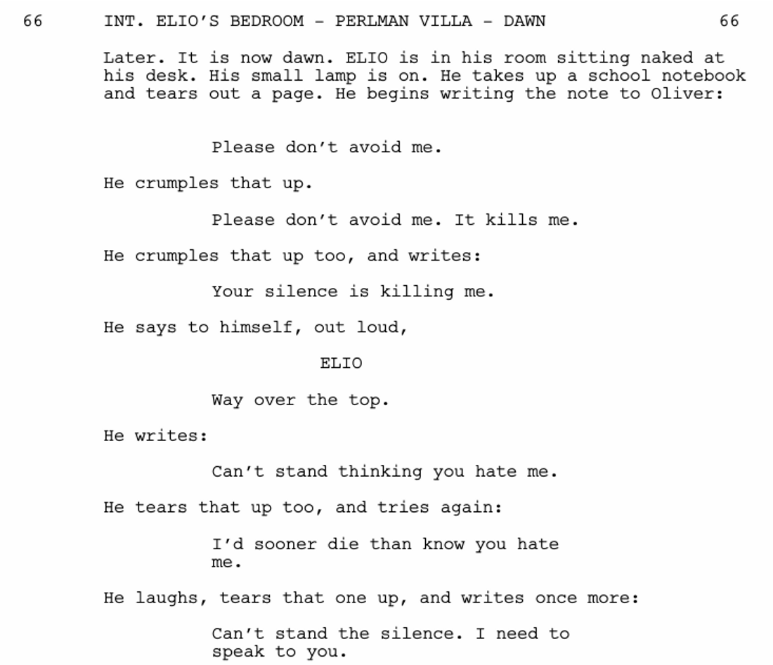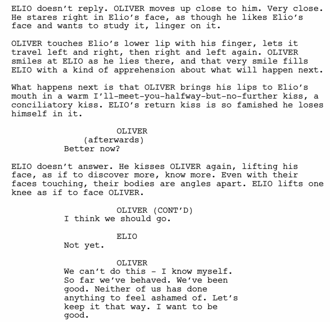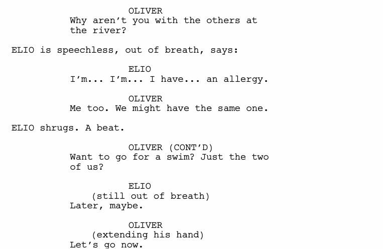 Elio and Oliver’s real meet-cute comes in the following scenes, during breakfast and their subsequent trip to the bank. The script emphasizes that Elio is already oddly fixated on Oliver, actively preventing himself from staring.