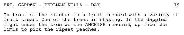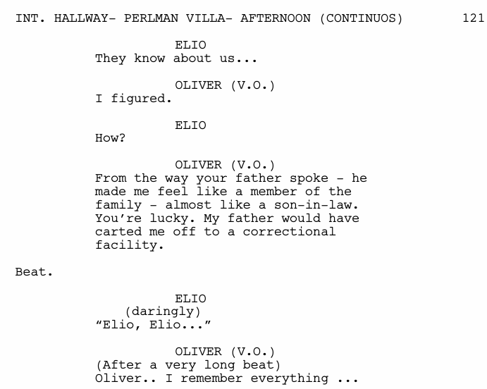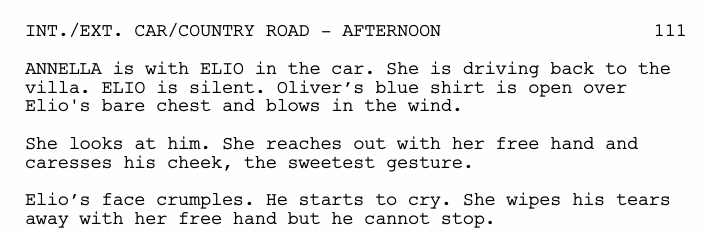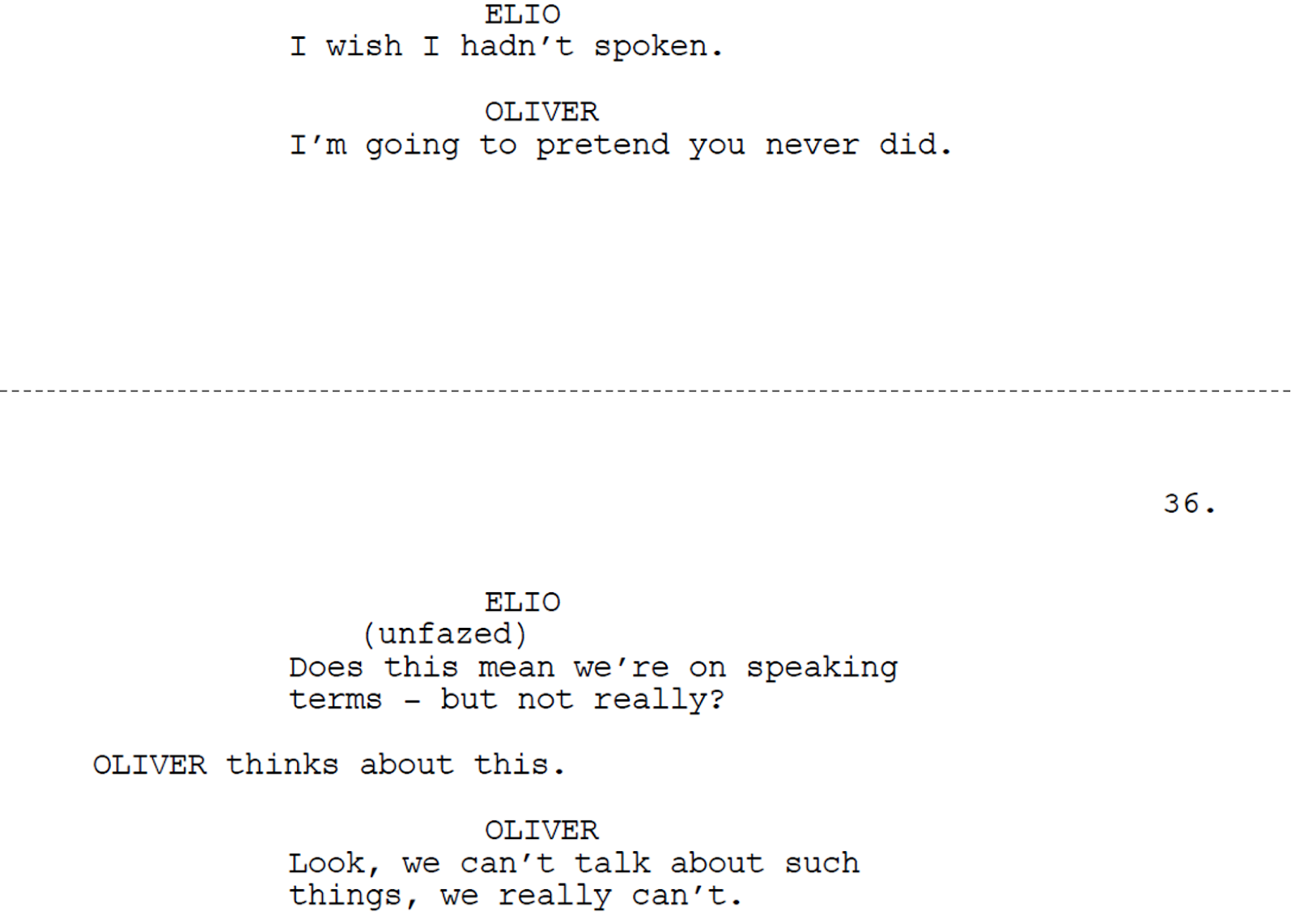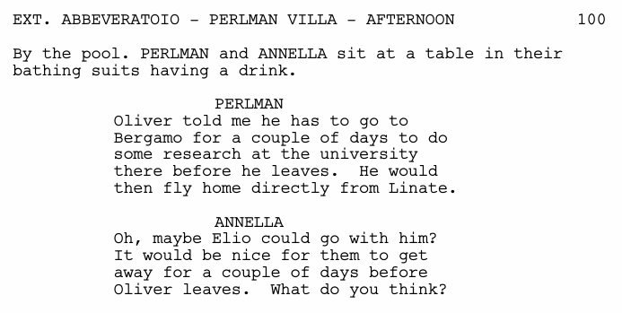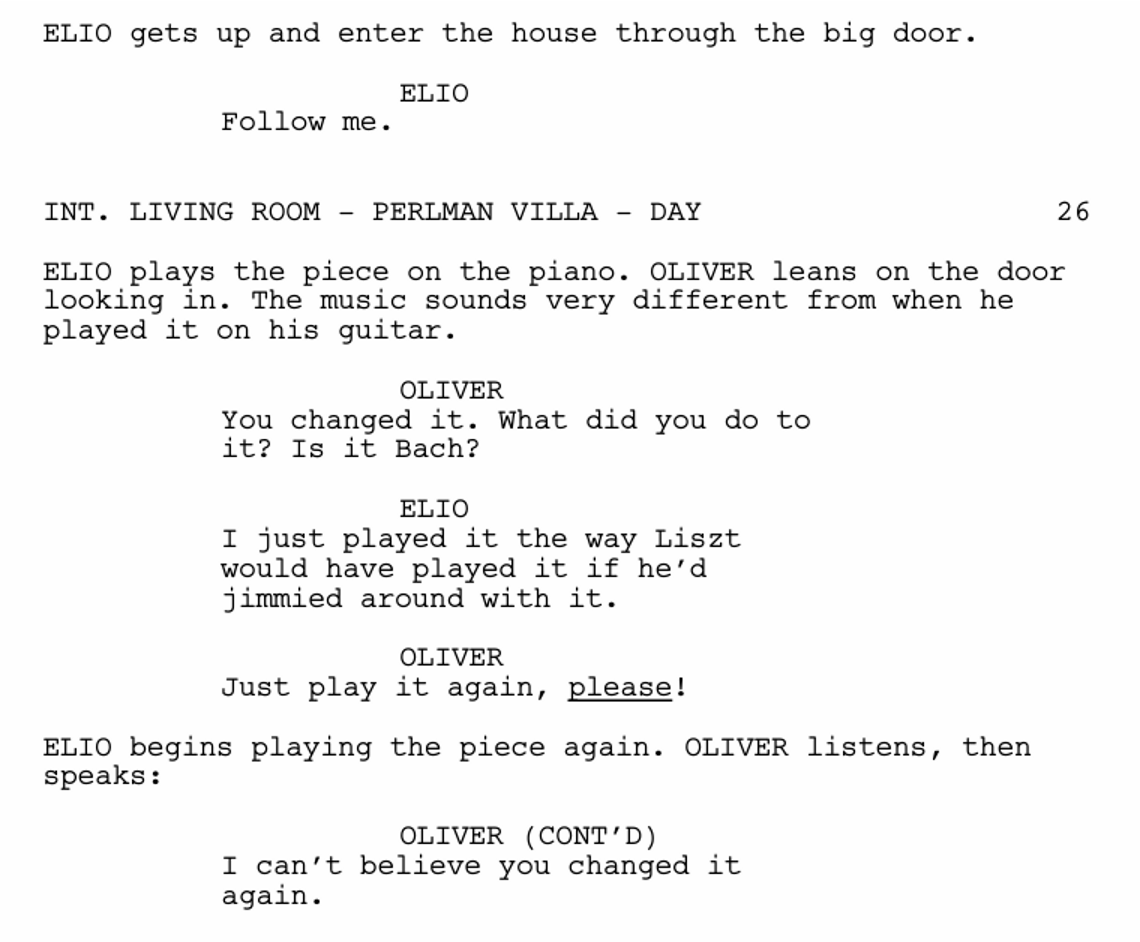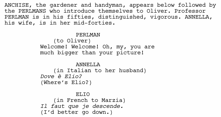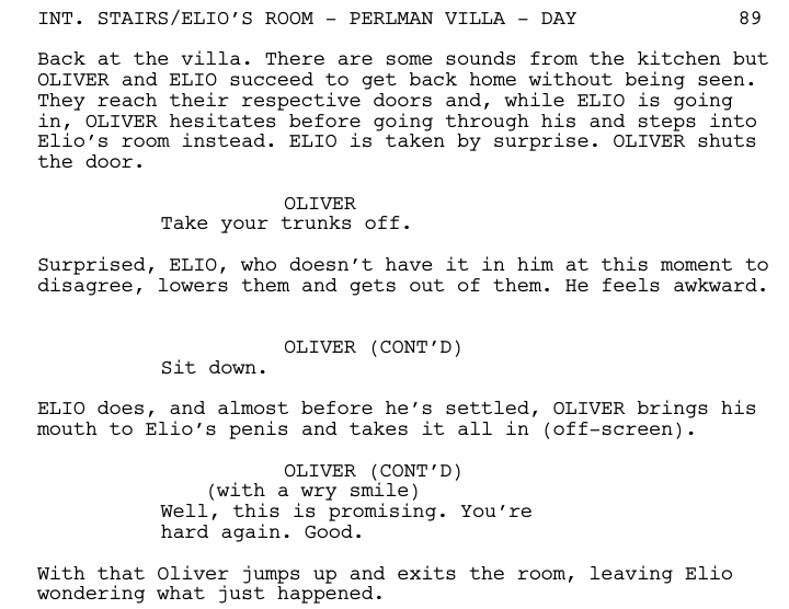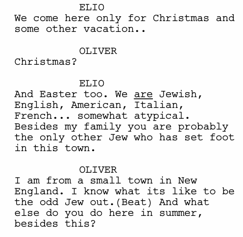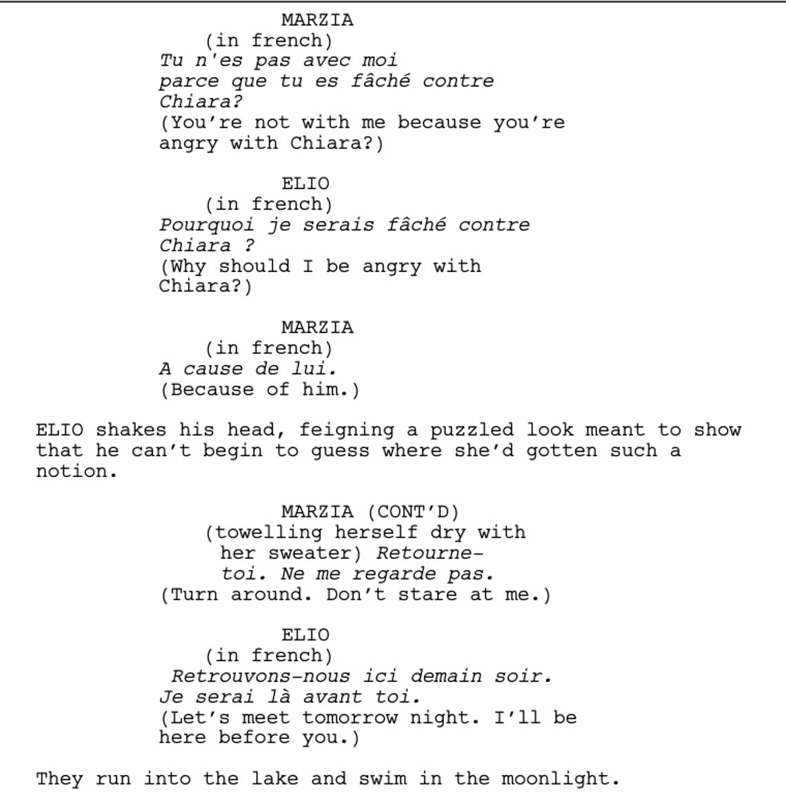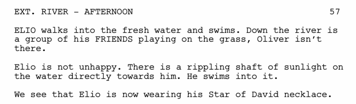 Elio and Oliver’s real meet-cute comes in the following scenes, during breakfast and their subsequent trip to the bank. The script emphasizes that Elio is already oddly fixated on Oliver, actively preventing himself from staring.