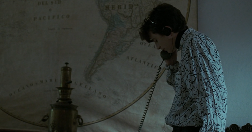 The film opens with Elio moving clothes from his closet, preparing for the incoming tenant Oliver. Marzie, his on-again, off-again fling, lies on the bed, notably fully clothed. Ivory’s script states that both Elio and Marzia have been in bed together prior to this scene, but later conversations allude to the fact that Elio is sexually inexperienced before this point.