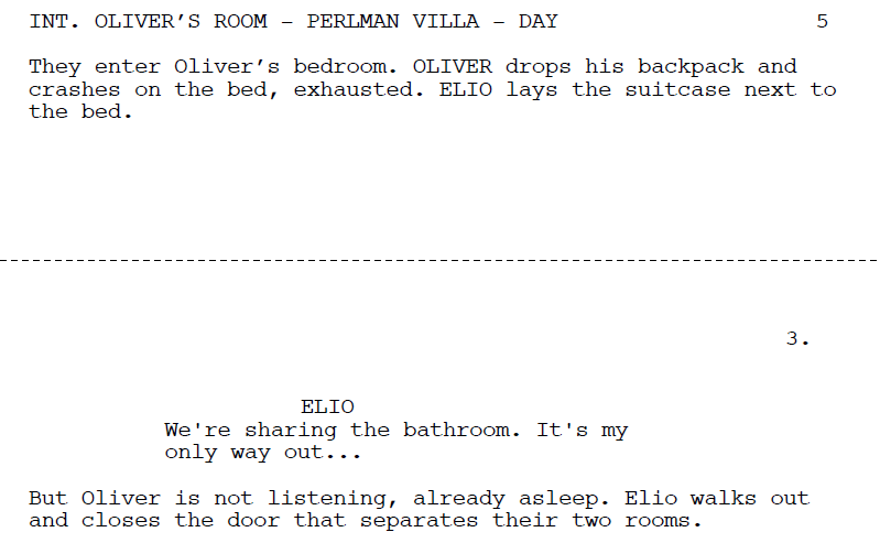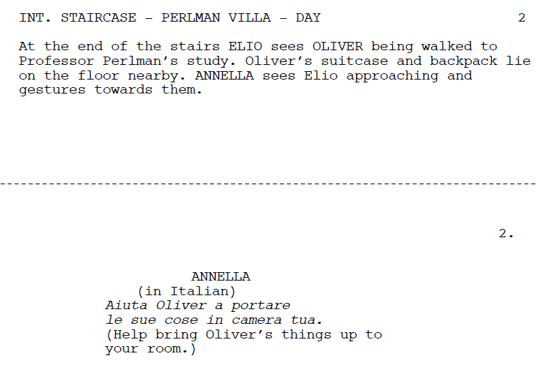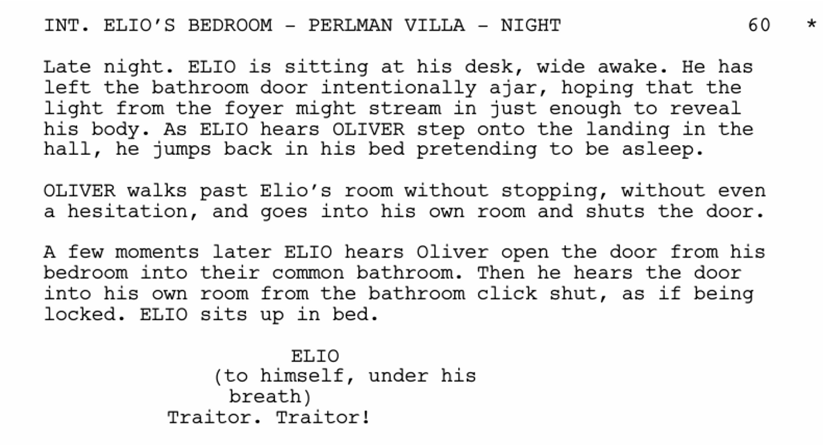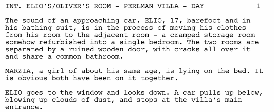 As Elio goes downstairs, I wanted to highlight a line added in the film that’s not in the screenplay. Annella (Elio’s mother) tells him to bring up Oliver’s things, but then Elio adds: “He’s here already?” This, to me, shows Elio already being secretive about his curiosity regarding Oliver. He knows Oliver is here, he just watched him arrive. Whether consciously or subconsciously, he’s hiding his intrigue from his mother with an unnecessary lie.