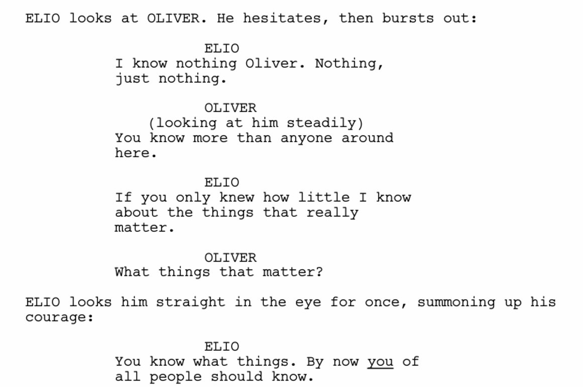 After this moment of Elio mustering the strength to speak up, he then shies away for the rest of the scene, not directly addressing Oliver again. Instead, he talks to his parents, almost as if asking Oliver a single direct question took all he had.
