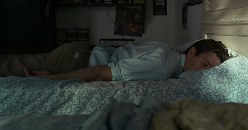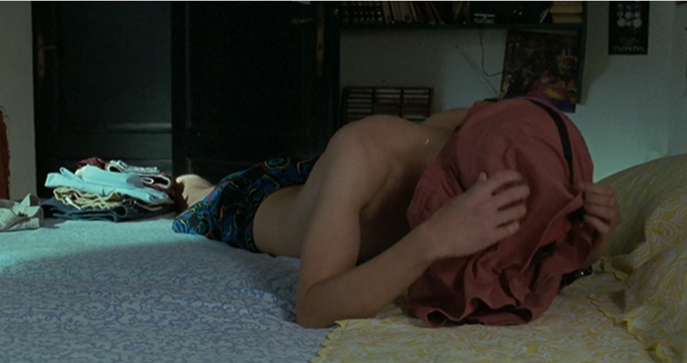 The haphazard way that Elio tosses his clothes around alludes to his immaturity, chucking them into a pile to be dealt with later. His treatment of Marzia also speaks to this, with him basically ignoring her presence and then getting distracted by the sound of Oliver arriving. Personally, the guitar on the bed makes me think that we’ve just missed Elio playing music at Marzia just before the movie starts.