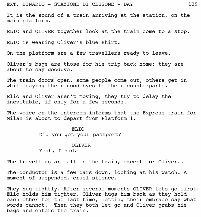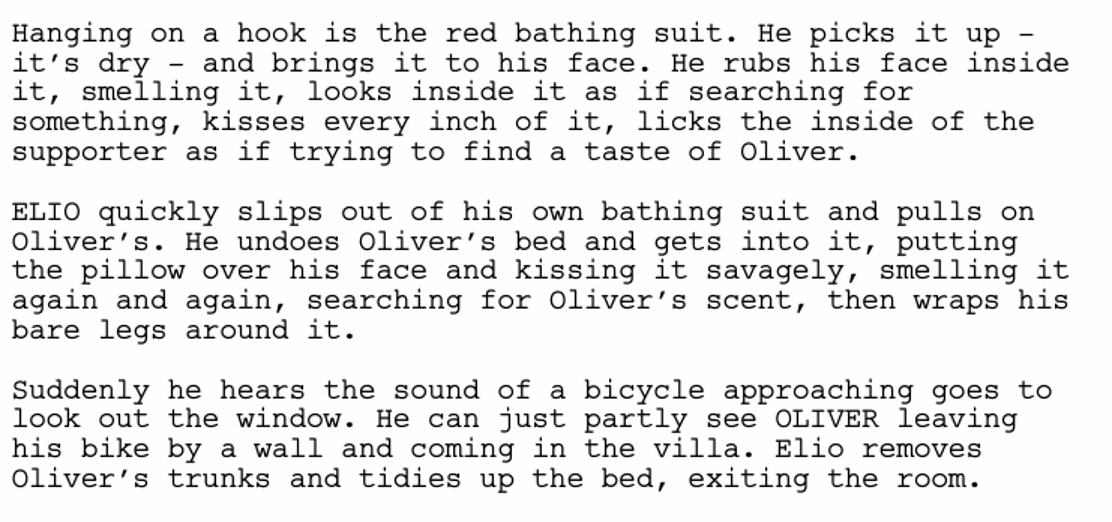 Elio completely surrenders to his desire when he sneaks into Oliver’s room to smell his bathing suit, a scene that’s even more intense in the script than the final film. It makes sense why it was changed in the final product, but the primal urge still comes across in the film; Chalamet plays Elio like he’s not even sure what he’s about to do, acting on instinct. The specific image of Oliver’s red swim trunks is also something that appears more in the script than the film; Oliver wears several different sets of trunks in the film, but in the script, Ivory has these red ones as his signature look.