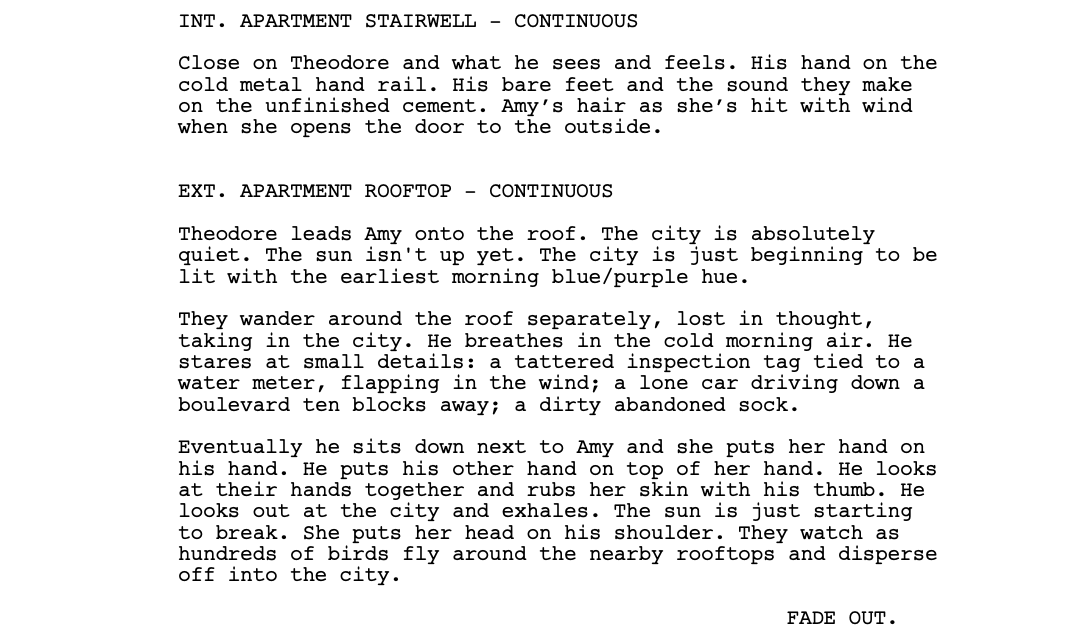 As Theodore reads aloud an actual personal letter he wrote to Catherine, he and Amy hold each other close and watch over the city from their rooftop. In this one moment, these two protagonists are finally together, finally forced to come to terms with the problems in their lives, and finally human.