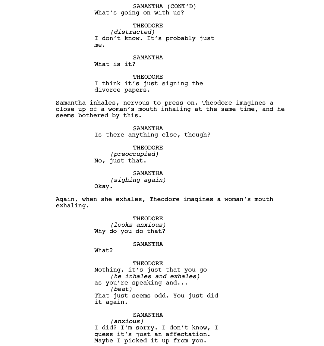 After his conversation with Amy, Theodore returns home. While he’s in bed and talking to Samantha, she brings up a strange question.