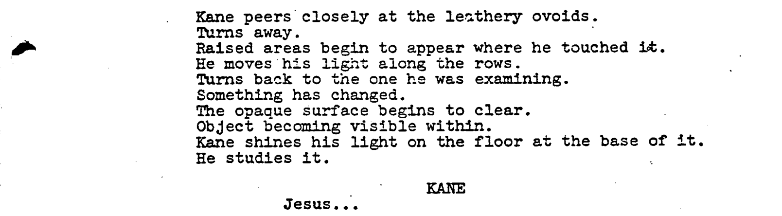 Alien is so enduring thanks to O’Bannon’s ability to blend science-fiction world-building with primal horror: the alien itself is a natural force, a predator whose design, lifecycle, and inevitability are revealed gradually. Dialogue is economical, and exposition is integrated seamlessly into action and environment, allowing tension to arise organically. It’s also a stylistic masterclass in presentation, greasy, dramatic, poetic at times and clinical at others. Without even accounting for H.R. Giger’s seminal designs, the script is a visual treat on the page.