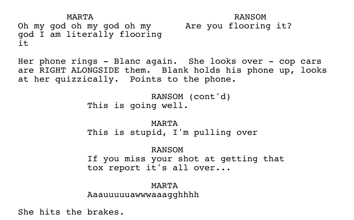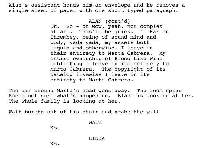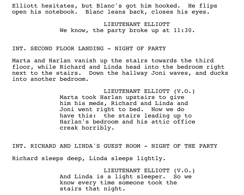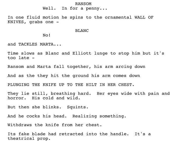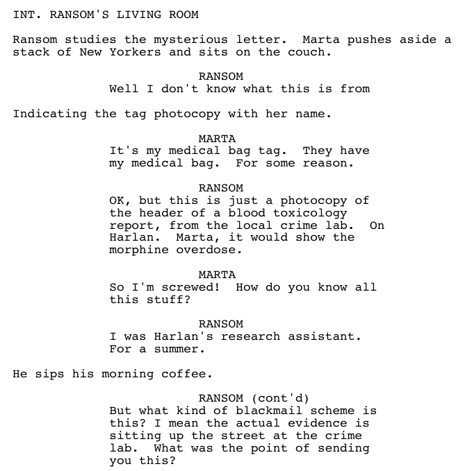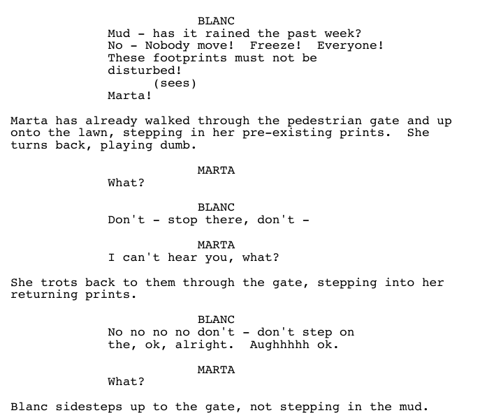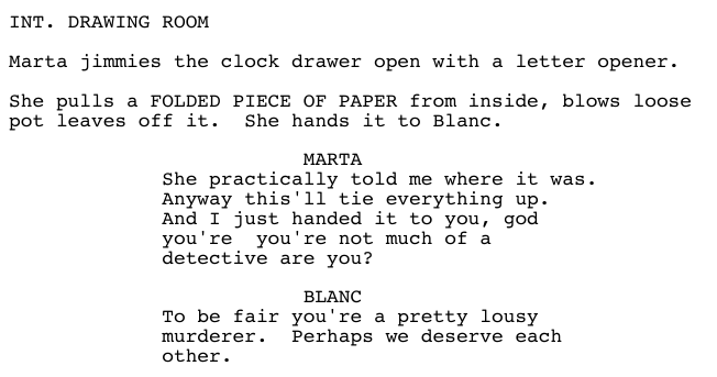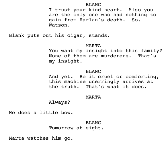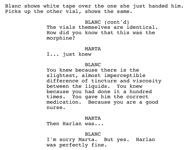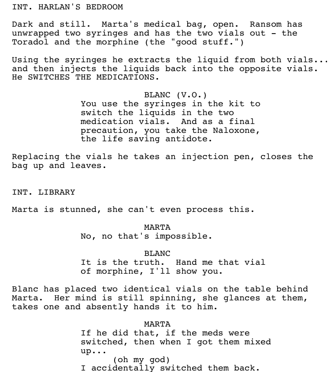 Johnson also firmly entrenches Knives Out in the present day, a feature that would only become more pronounced in the sequel Glass Onion. The characters discuss President Trump and immigration issues that were hot at the time and still very relevant now. ‘The butler did it’ is the classic murder mystery saying. If not the butler, then the maid; always some member of the help and not a member of the upper class. In Knives Out, Johnson lets us know early on that our main character, Marta, a member of the so-called ‘help,’ did indeed commit the central crime. We aren’t asked to empathize with the wealthy Thrombey family, but with the working-class, immigrant nurse that has, to her knowledge, literally killed someone (albeit accidentally). From there, we balance Marta trying to get herself out of suspicion with Blanc’s investigation; the murder mystery solves itself at the end of the first act but then keeps going, asking more and more questions. Just like Blanc says, the hole of the donut has a second, smaller donut in the middle. Twists upon twists, questions upon questions, and fun upon fun. Let’s get into this script!