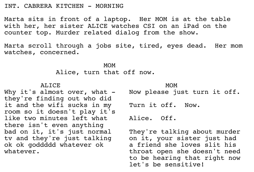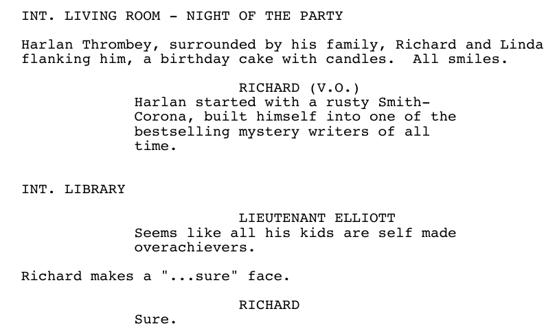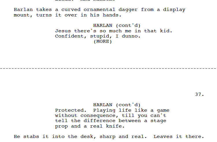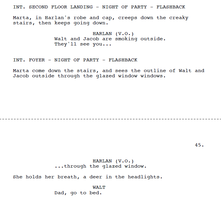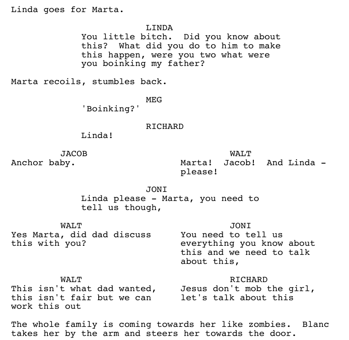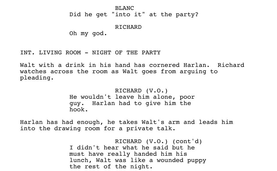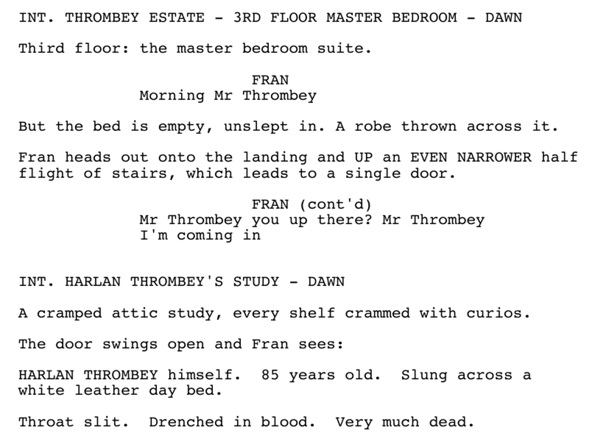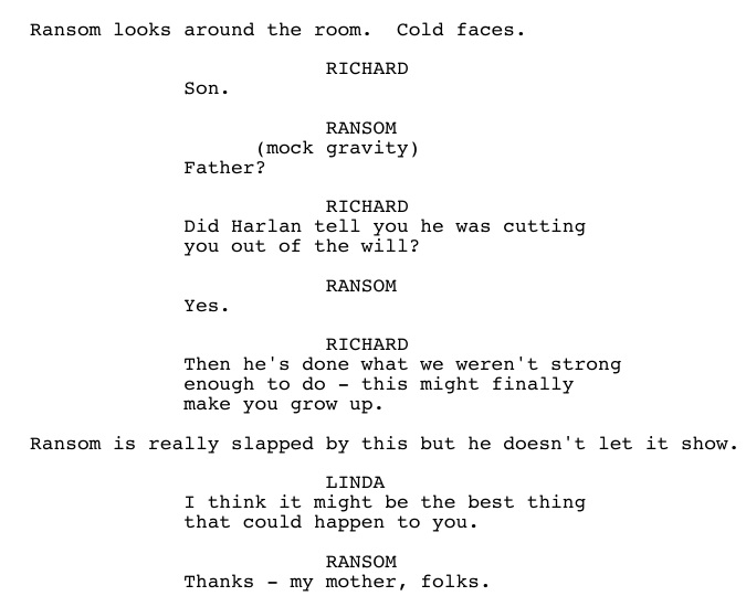 Johnson also firmly entrenches Knives Out in the present day, a feature that would only become more pronounced in the sequel Glass Onion. The characters discuss President Trump and immigration issues that were hot at the time and still very relevant now. ‘The butler did it’ is the classic murder mystery saying. If not the butler, then the maid; always some member of the help and not a member of the upper class. In Knives Out, Johnson lets us know early on that our main character, Marta, a member of the so-called ‘help,’ did indeed commit the central crime. We aren’t asked to empathize with the wealthy Thrombey family, but with the working-class, immigrant nurse that has, to her knowledge, literally killed someone (albeit accidentally). From there, we balance Marta trying to get herself out of suspicion with Blanc’s investigation; the murder mystery solves itself at the end of the first act but then keeps going, asking more and more questions. Just like Blanc says, the hole of the donut has a second, smaller donut in the middle. Twists upon twists, questions upon questions, and fun upon fun. Let’s get into this script!