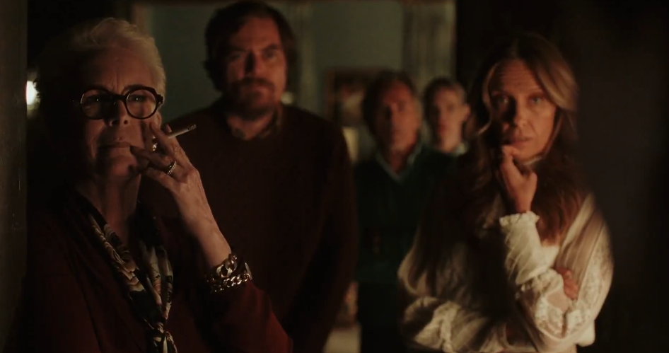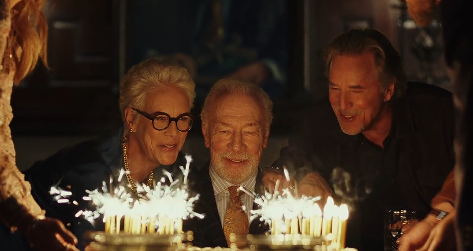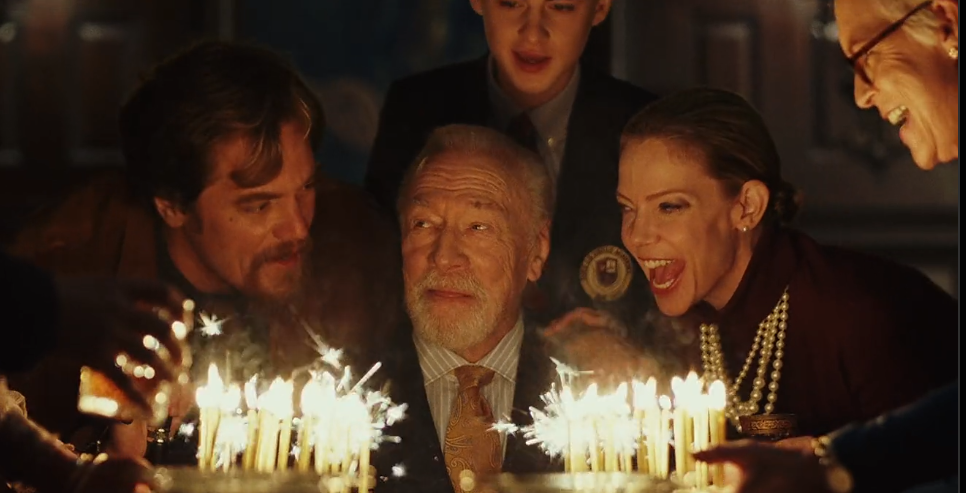 We’re introduced to our cast of suspects, the Thrombey family, via police interviews. On a first watch, we’re searching for every detail that could point to them as the murderer - we know what kind of story this is. We don’t know that by the end of the first act, the murder will already be ‘solved’ for us. These interviews with the Thrombeys also introduce one of the film’s primary narrative devices: unreliable flashbacks. Many of the Thrombeys tell the story of Harlan’s birthday differently, and the best illustration of their inconsistent tellings… each of them places themself right by Harlan’s side.