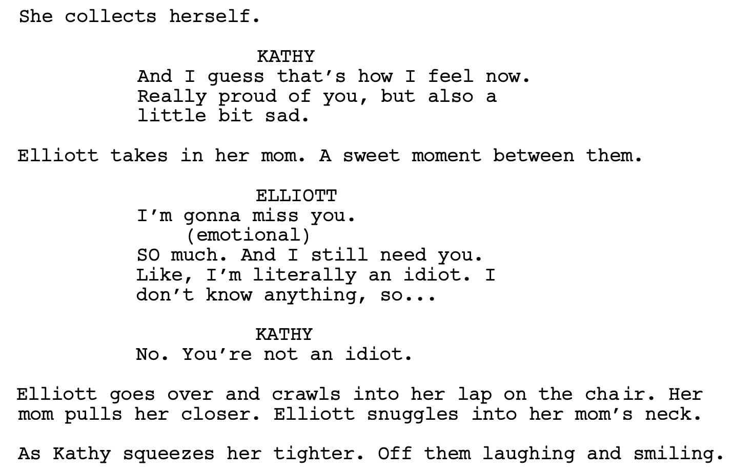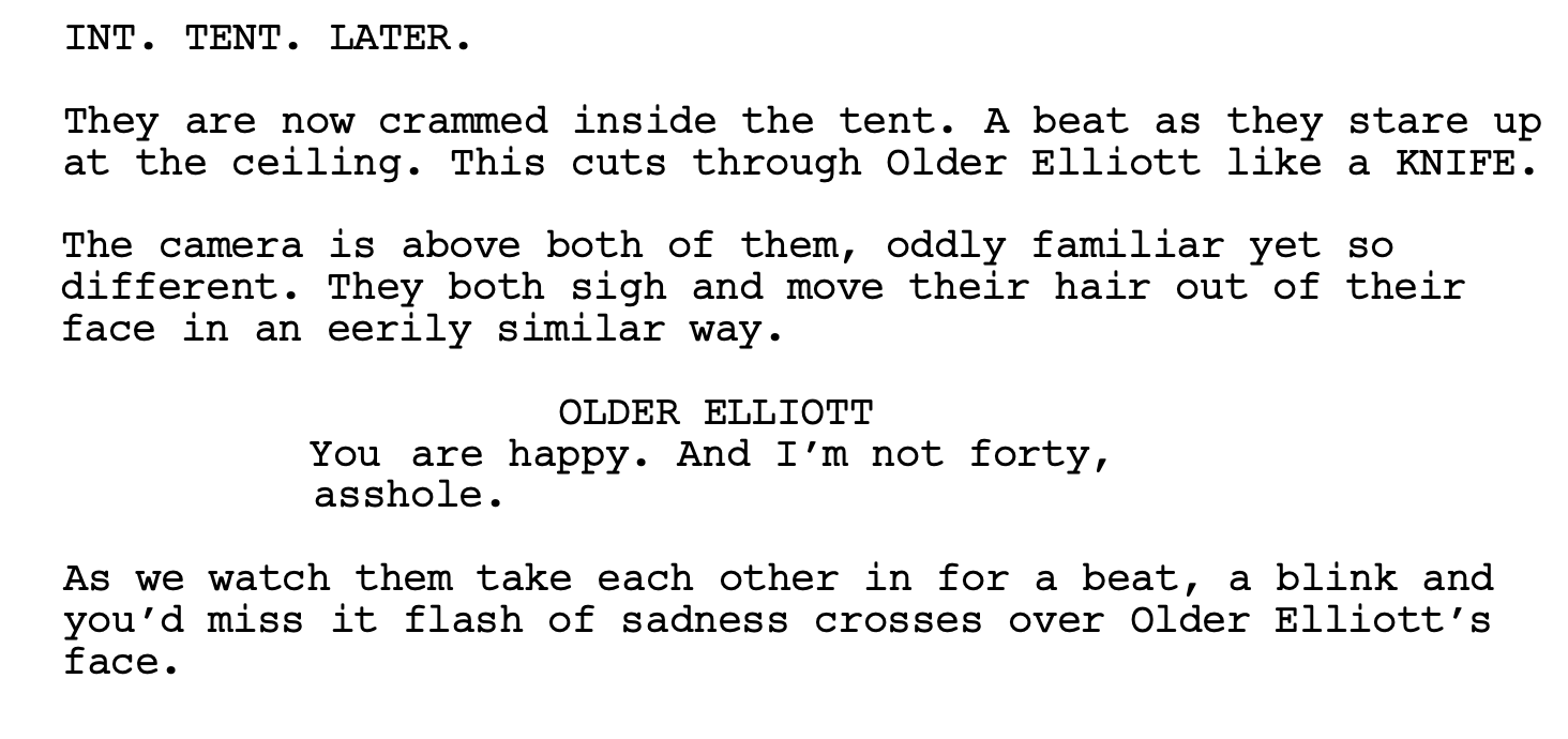 Park’s description of her protagonist is such a love letter. She devotes an entire paragraph to ELLIOTT. You can see it compared to the description of Elliott’s friends RO and RUTHIE (also…Park knew that she was going to direct her own screenplay and therefore was able to break the don’t-name-two-characters-similar-names rule).