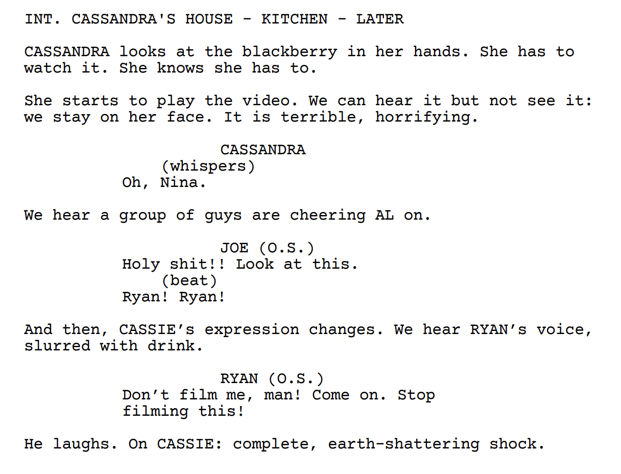 Then Madison shows up. Cassandra apologizes to her and reassures her that nothing happened when she got drunk. But the scare got to Madison and she started to think about Nina and what happened to her and she remembered that there had been a tape that was sent around depicting Nina’s rape — and Ryan is in the video.