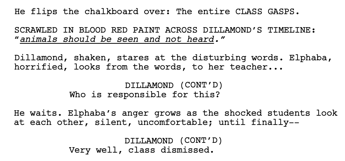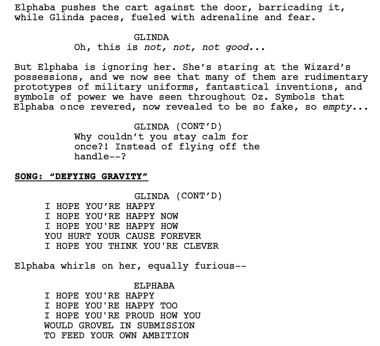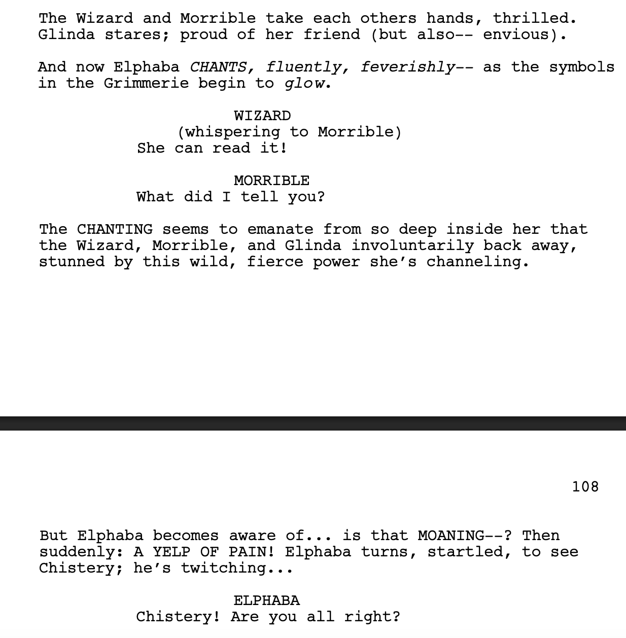 Finally we are introduced to our true heroine, not by her propaganda epitaph, but her name: ELPHABA (20s, badass. Her razor sharp mind and tongue serve as armor, to protect her tender soul from moments like these). Elphaba arrives at Shiz with her younger sister, “NESSA. Now also in her 20’s; Nessa is beautiful, seemingly shy compared to Elphaba, but with her own brand of inner fierceness.” Again, the writers omit the very important information that Nessa uses a wheelchair.