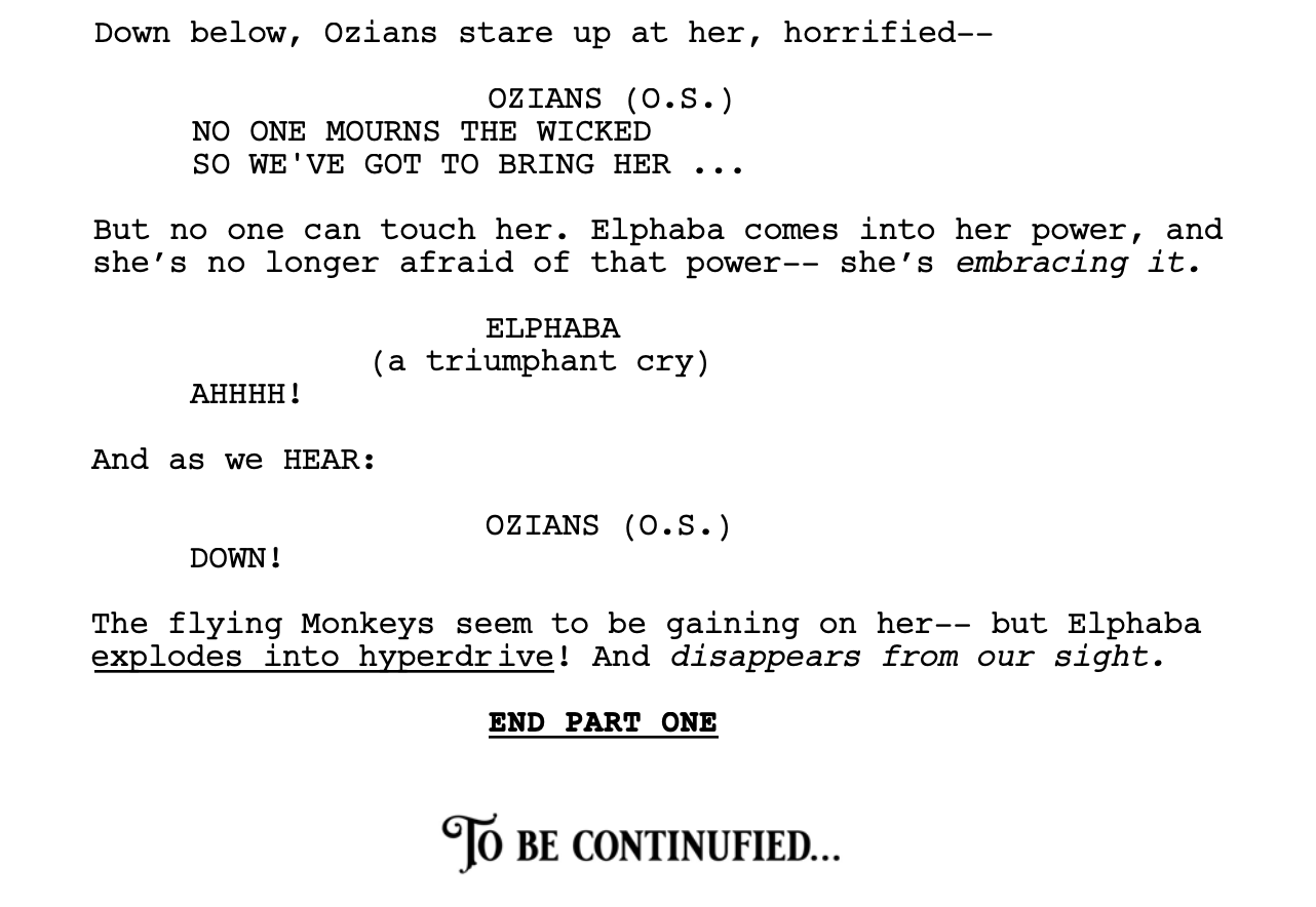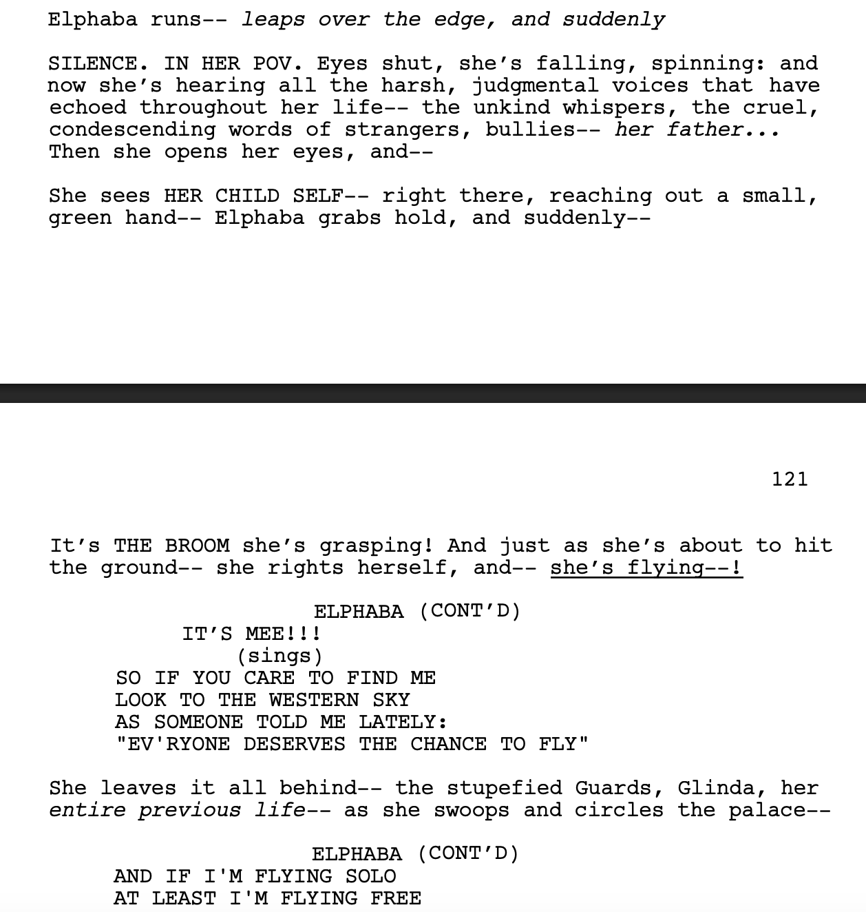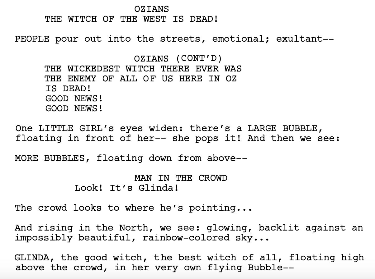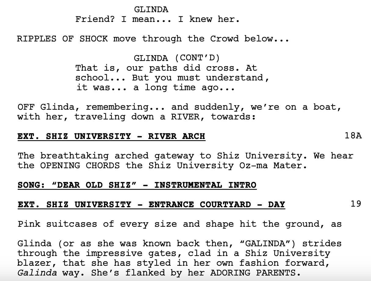 Here, the story goes back in time — though note how the screenwriters do not indicate specifically, such as with a slugline, except to note that Glinda was remembering and by referring to her “as she was known back then”: GALINDA.