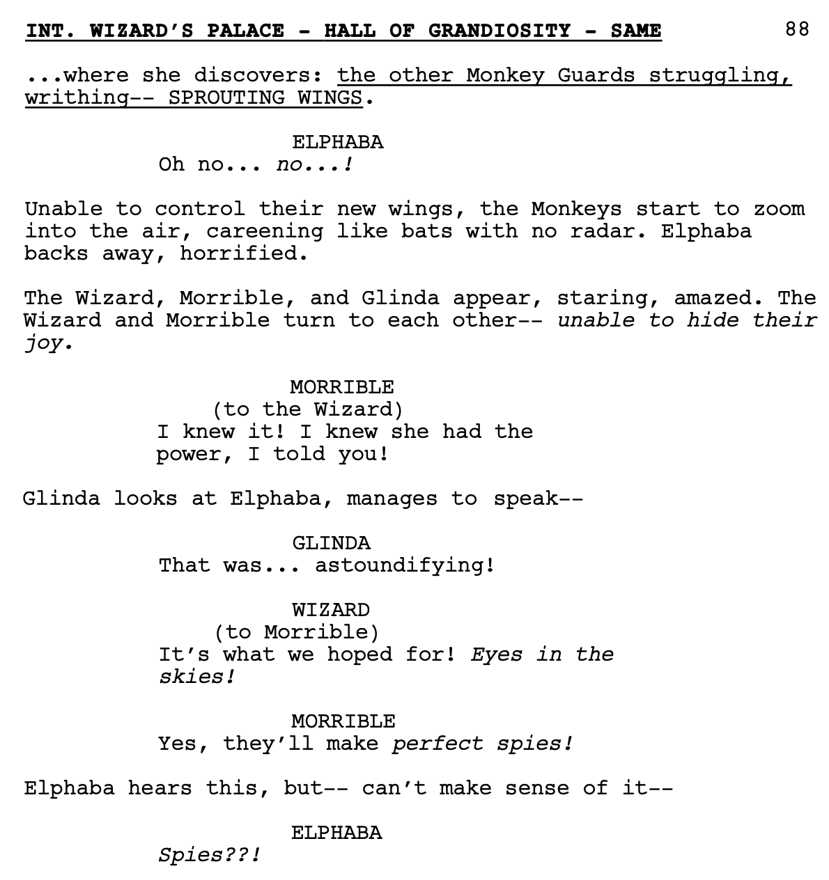 When she sees the effects of the spell taking place, giving the Monkey Chistery wings — but painfully — she tries to undo the spell. To her horror, Madame Morrible tells her that spells from the Grimmerie cannot be undone. Furthermore, it was not just Chistery who was transformed, but the entire contingent of Monkey Guards.