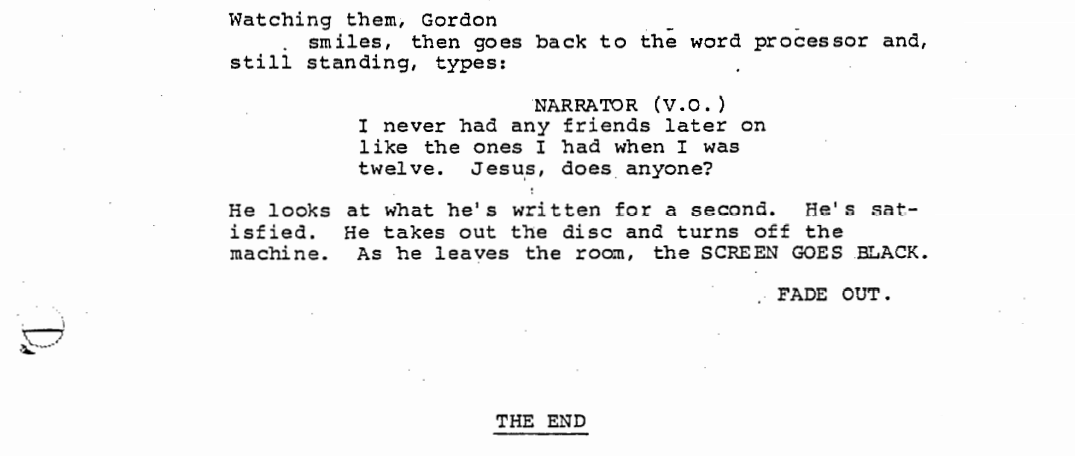 Finally, we cut back to present day, where it’s discovered that the man narrating is now a middle-aged Gordie writing a book about that time he and his buddies went on an adventure to find a dead body. He struggles to come up with the final sentence when his own son, about 12 years old, enters the room with his buddy. They want to go swimming and have to wait for Gordie to finish before they can do so. Gordie tells them he needs one more minute and to wait outside. As the boys run outside, Gordie sees them playing on the front lawn and is once again reminded of his own childhood buddies. He goes back to his computer and finishes his book.