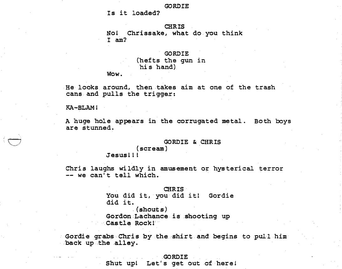 Gordie begins his trek to meet up with his friends when Chris is dropped off next to him by a pickup truck. Once they’re alone, Chris takes Gordie aside to show him what he took for their adventure: his dad’s .45.