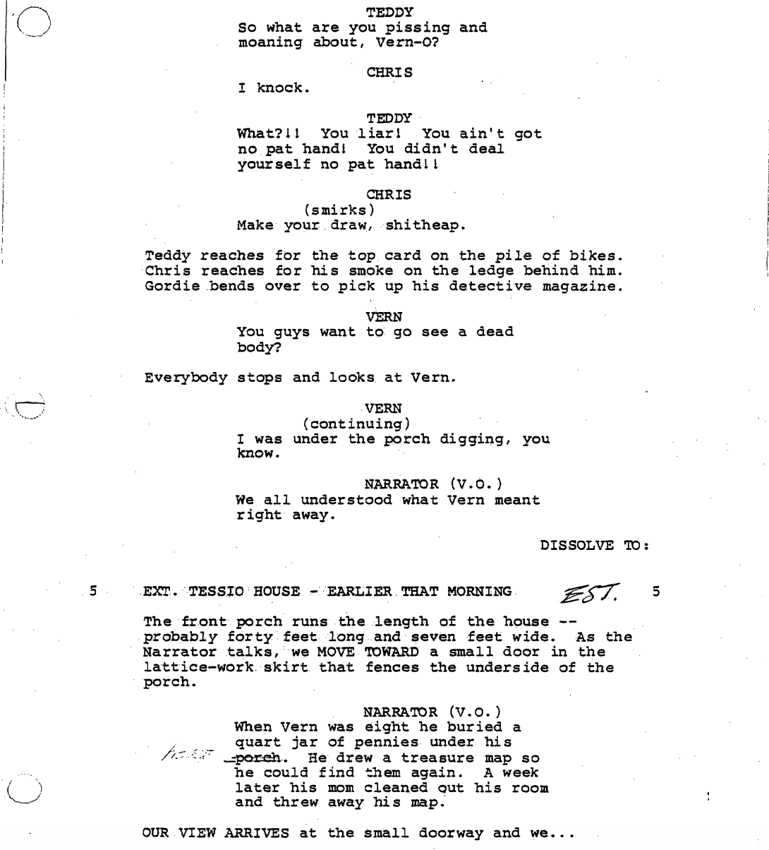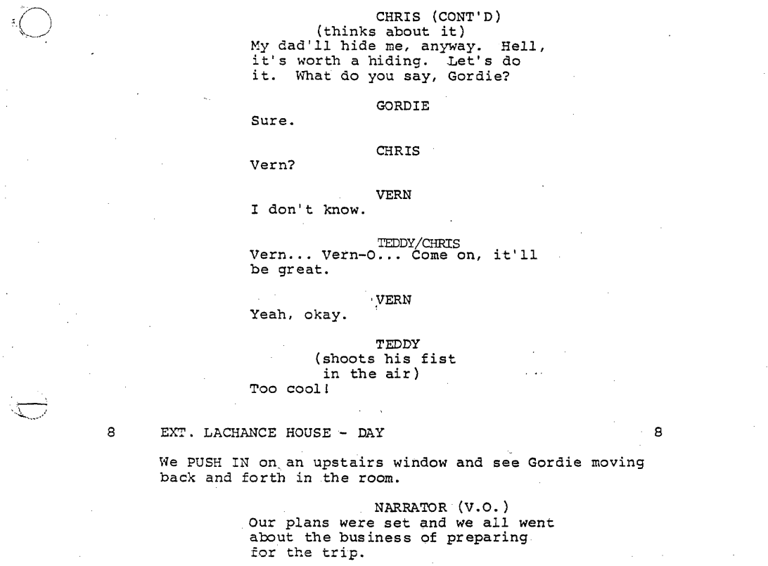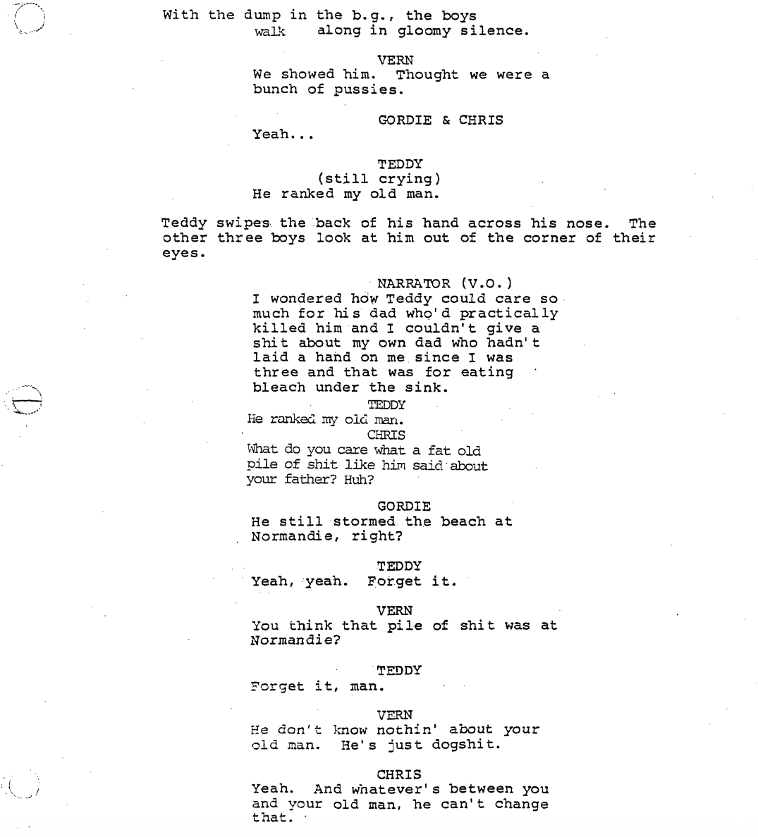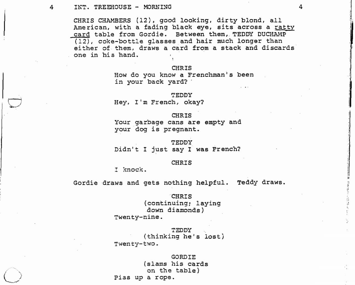 The narrator takes us back to the year 1960 in a little town called Castle Rock, where we find a twelve-year-old Gordon (then going by Gordie) playing cards in a treehouse with his hoodlum friends Chris Chambers and Teddy Duchamp. The three of them smoke cigarettes and talk shit, like all kids do, and take in the final week of summer vacation together.